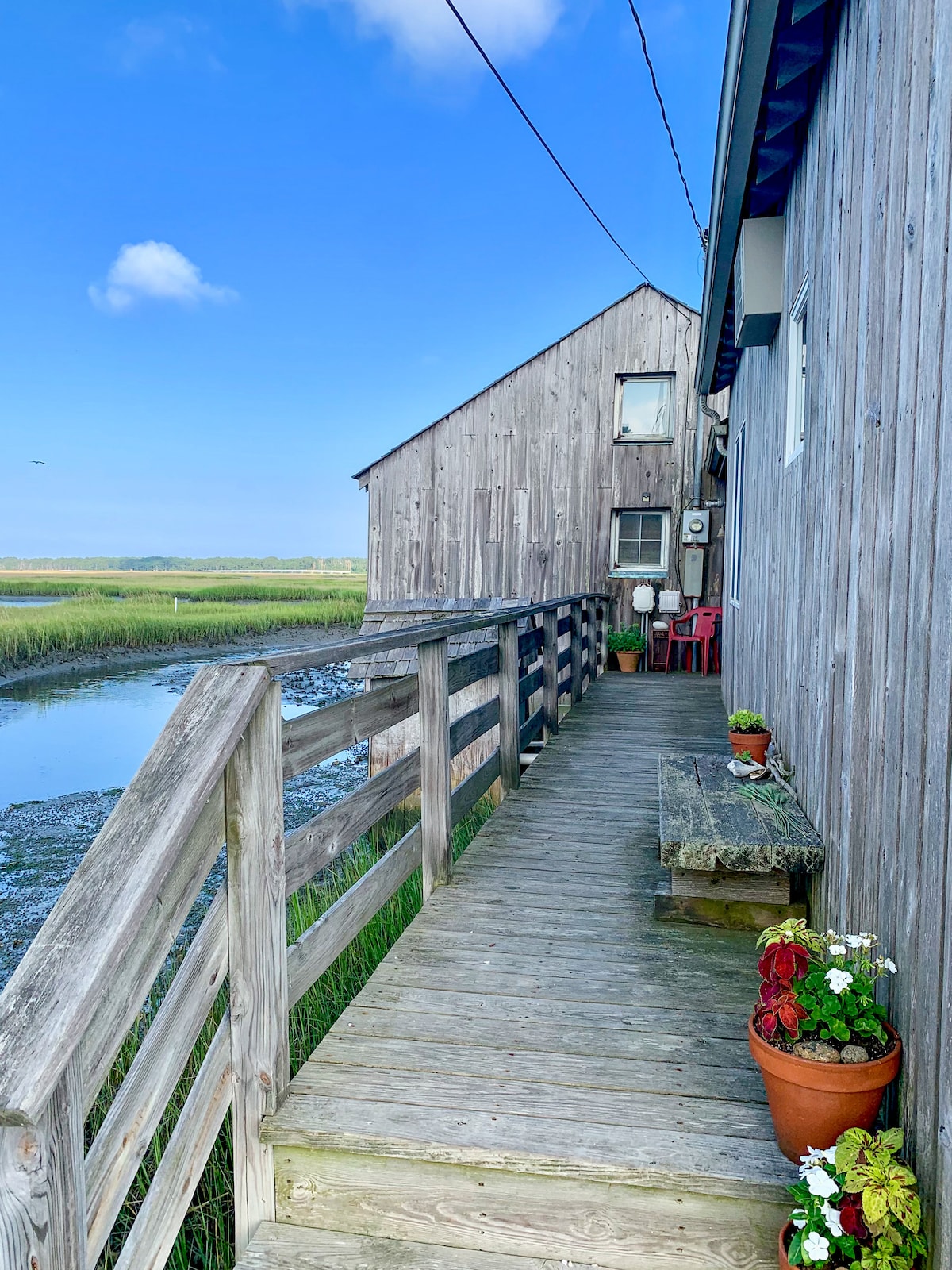 Détendez-vous dans cet espace calme et élégant. Ce logement a été rénové avec amour par ses propriétaires actuels. Chaque détail a été pris en compte. À l'intérieur, vous trouverez des chambres bien aménagées conçues pour la fonction et le confort. À l'extérieur, la tranquillité vous attend. Profitez du café du matin avec vue sur l'eau, faites du kayak sur la baie, terminez la journée en vous relaxant au coin du feu. Rendez-vous à Assateague pour nager, surfer, pêcher ou marcher jusqu'au phare. Revenez avec la prise du jour pour utiliser la station de nettoyage du poisson et la douche extérieure.