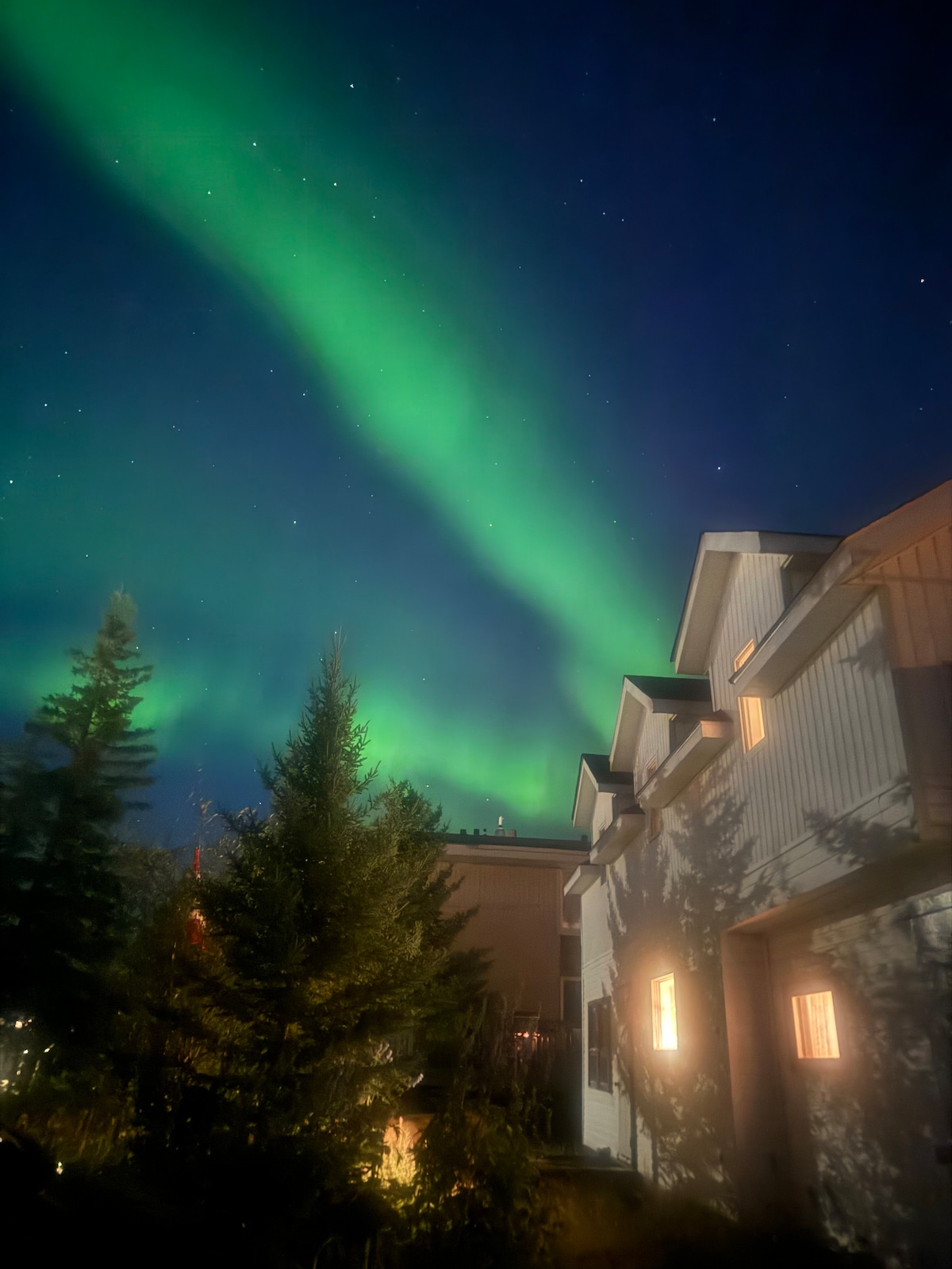 Cette chambre dispose d'un lit Queen Size (pour deux personnes). Situés en bordure de la ville, nous sommes dans un endroit idéal pour voir les aurores boréales depuis notre terrasse. Accès facile à la ville et aux attractions. Nous aimons les livres, les cartes, les pianos et le plein air. C'est une maison calme, nous ne possédons pas de téléviseurs, bien que le Wi-Fi soit bon pour le streaming si vous souhaitez vous installer confortablement et regarder un film. Ce logement paisible offre un séjour détente pour toute la famille.