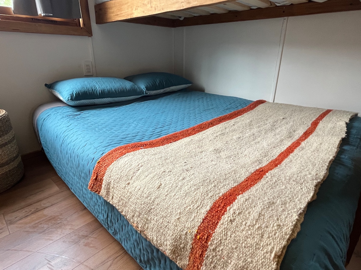 Cet espace unifié a tout dans un seul environnement, ses lits sont confortables, tous ses éléments sont en bois indigène et sa boîte pour laisser des chaussures est en bois avec de la pierre d'agate de la plage de Puerto Guadal. Sa salle de bain est privée, la cuisine est entièrement équipée avec un réfrigérateur et fait partie de l'espace.
