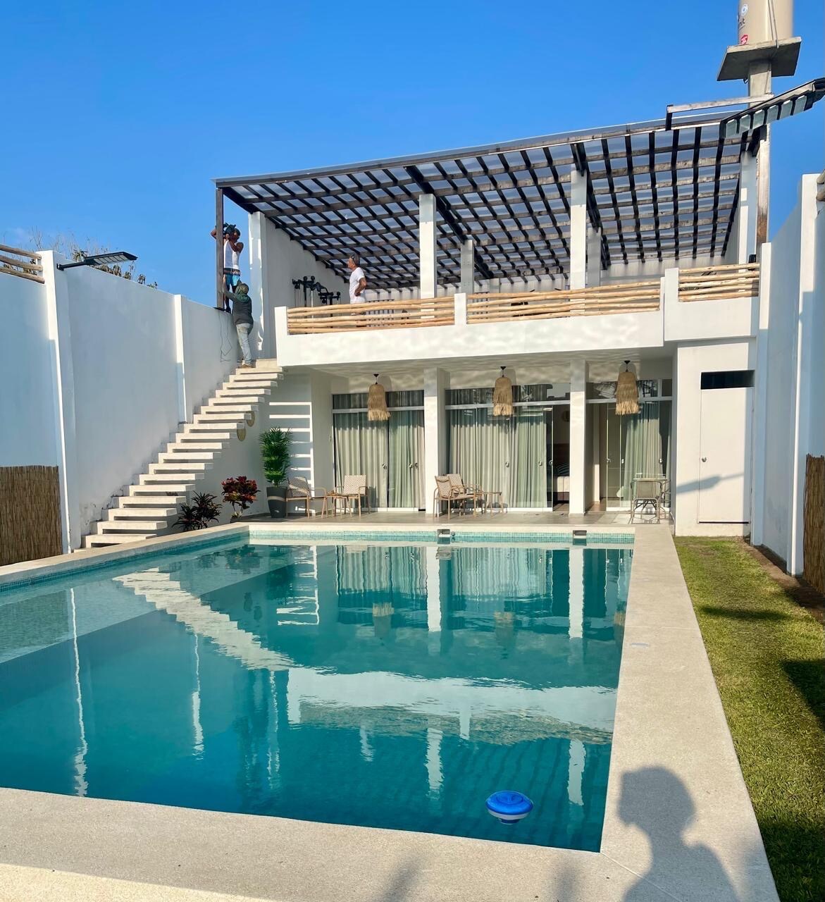 Te encantará este adorable lugar para quedarte porque es privado, es de estreno, tiene una piscina con pepelma vitrificado linda y muy grande, cortinas black out, baños con diseño moderna en cada habitación, camas queen, decoración minimalista y playera, a dos metros y medio del mar, ideal para parejas o para familia, para descansar y escaparse del calor, o para disfrutar, tiene gimnasio, refrigeradora externa, ducha externa, terraza y muebles de terraza fuera de los dormitorios