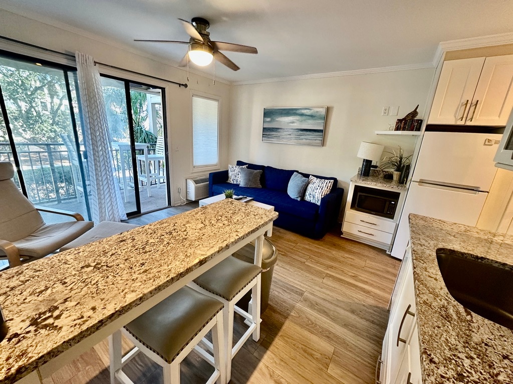 Freshly decorated in coastal decor, this beachfront condo sleeps up to 4 and is located right by Coligny, Hilton Head's chicest neighborhood. Freshly furnished unit includes a spacious king bed and queen sofa sleeper, both fitted with luxurious memory foam mattresses. Just a three minute walk to sandy beaches, and you can catch a glimpse of gentle tides from your own private balcony! The villa is full of amenities including beach chairs, beach umbrella, games and much more.