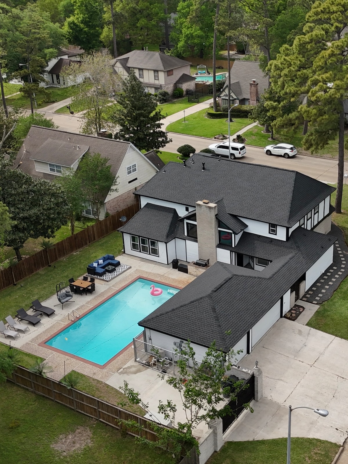 Retraite rustique et confortable de 4 chambres, dans un complexe sécurisé, à seulement 5 minutes de The Woodlands 🌲✨ Profitez d'un grand patio extérieur avec 2 pavillons de jardin et un foyer extérieur, idéal pour se détendre lors des soirées texanes 🔥 Adapté aux familles avec lit bébé, lit d'enfant et chaise haute 👶 Le vaste stationnement peut accueillir plusieurs véhicules 🚗 Arrivée anticipée/départ tardif possible (moyennant supplément) ⏰ Animaux de compagnie au cas par cas 50 $ par animal 🐾 Nettoyé professionnellement après chaque séjour 🧼 Confort tendance et ambiance champêtre paisible 🤎