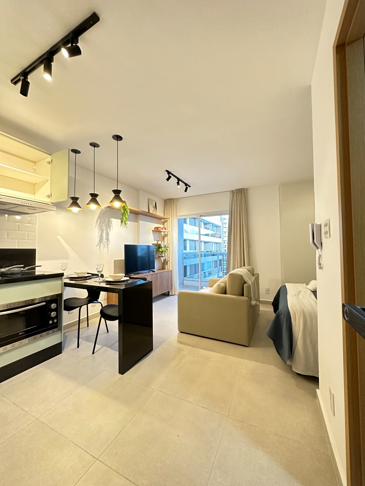 Appartement de type studio super confortable avec un emplacement imbattable pour vos rendez-vous professionnels et/ou de loisirs. ► Lit double avec matelas à ressorts ; ► Smart Tv 40" (y compris Netflix, Prime Video, Disney+ et Globoplay) ; ► Climatisation ; ► Ventilateur turbo ; ► Store de type occultant ; ► Penderie avec cintres; ► Haut-parleur Bluetooth ; Bureau/►table de travail avec lampe ; ► Canapé-lit pour deux personnes ; ► Table pour manger ; ► Cuisine équipée pour préparer de petits repas.