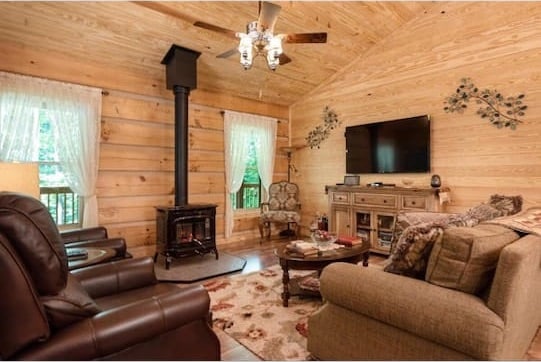 Inviting private mountain cabin in a wooded setting with 2 queen bedrooms & black out curtains. Enjoy the open concept with a stocked kitchen, reclining couch and chair and wood-burning fireplace. Enjoy the private spacious porch complete with hot tub, hammocks, rocking chairs, and outdoor dining. Fire up the gas grill for a cookout, or wind down around the firepit under the stars. In a true country setting—expect barking dogs, buzzing bugs, and plenty of rustic charm. Pet-friendly too!
