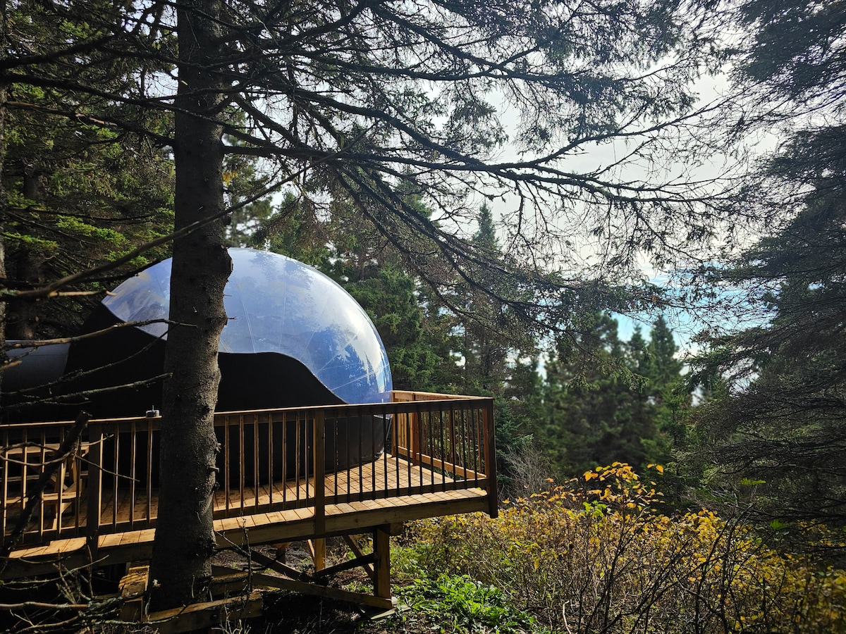 Vivez une expérience unique sous les étoiles, en plein cœur de la forêt gaspésienne. Profitez d’une vue imprenable sur la nature environnante, confortablement installé sous la couette. Cette expérience immersive vous offre un parfait équilibre entre confort et connexion à la nature. La partie transparente de la bulle permet d’admirer la forêt et la voie lactée, tandis que la partie avant, en tissu opaque, préserve votre intimité. Les bulles sont situées chez Folies Boréales.