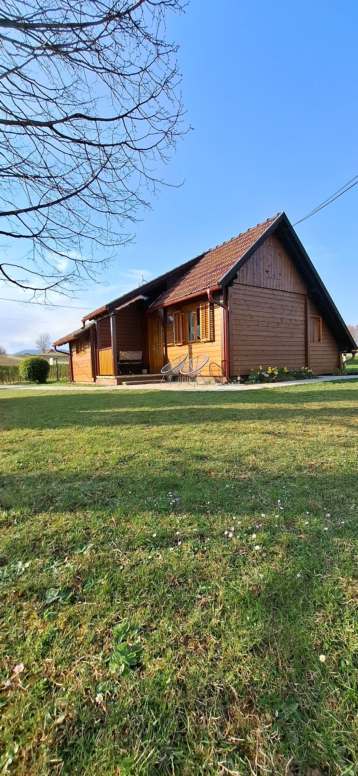 Un chalet en bois, décoré de façon moderne avec des détails de tradition. Découvrez les bienfaits de la vie moderne (wi-fi, climatisation, télévision, électroménager…) entourée à la fois de vignobles et de vergers (qui doivent être entretenus, alors attendez-vous à quelques vignerons dans l'entreprise et ne prenez pas le bruit occasionnel comme un mal). Reposez-vous sur une grande terrasse surplombant la vallée de la rivière Sutla, promenez-vous, jetez un coup d'œil à la falaise, profitez de la nature (il est inévitable de rencontrer quelques habitants de cette nature).