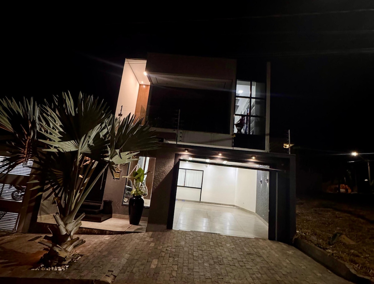 Maison spacieuse et confortable dans un quartier calme, idéale pour les familles et les groupes. La suite dispose d'un lit double, de la climatisation et d'une salle de bain. Vous y trouverez également une chambre avec un lit simple, un lit gigogne et une armoire. Salle de bain sociale attenante, salon avec climatisation, cuisine intégrée complète et toilettes. Dans le garage, il y a de la place pour 3 voitures. Situé à Cruzeiro do Oeste, la « ville des dinosaures », célèbre pour son musée de paléontologie, vous ne serez qu'à 28 minutes d'Umuarama/PR.