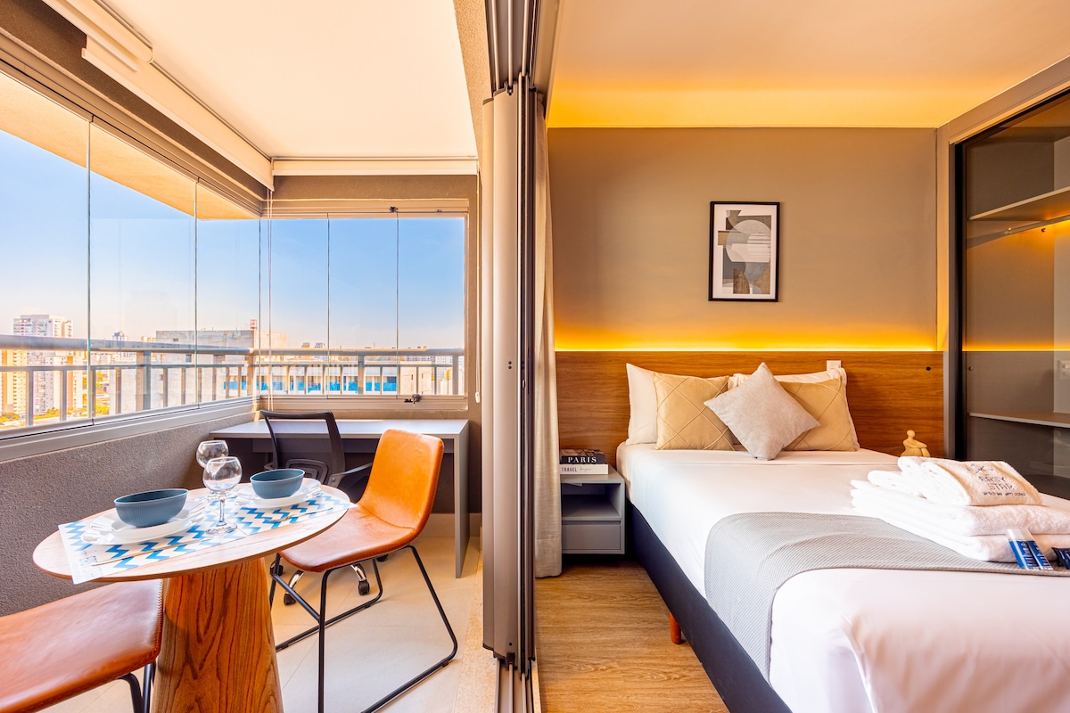 Sinta-se em casa neste studio design recém-renovado, onde cada detalhe foi pensado para seu conforto. Decoração minimalista cria um refúgio tranquilo e sofisticado após um dia intenso em São Paulo. Espaço integrado com cama de casal, cama de solteiro, cozinha, máquina de lavar e AC para até 3 pessoas. A varanda iluminada é ideal para trabalhar, ler ou relaxar. Prédio com portaria 24h garante segurança. Bairro residencial tranquilo com transporte público, mercados e restaurantes próximos.
