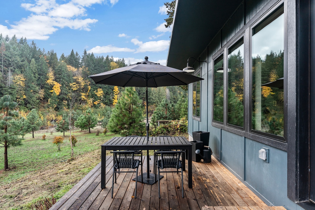 Ce studio privé dispose de sa propre entrée, d'une salle de bain et d'une kitchenette, et offre le mélange parfait de confort, de commodité et d'abordabilité. Le centre-ville de White Salmon est à quelques pas seulement, où vous trouverez une boulangerie, une épicerie, de charmantes boutiques et une variété de restaurants à explorer. La chambre est soigneusement conçue avec une sensation lumineuse et apaisante, et oui, nous aimons les chiens bien élevés ! Remarque : le studio est situé dans une maison occupée par son propriétaire, mais le logement Airbnb est privé et ne comporte aucun espace partagé.