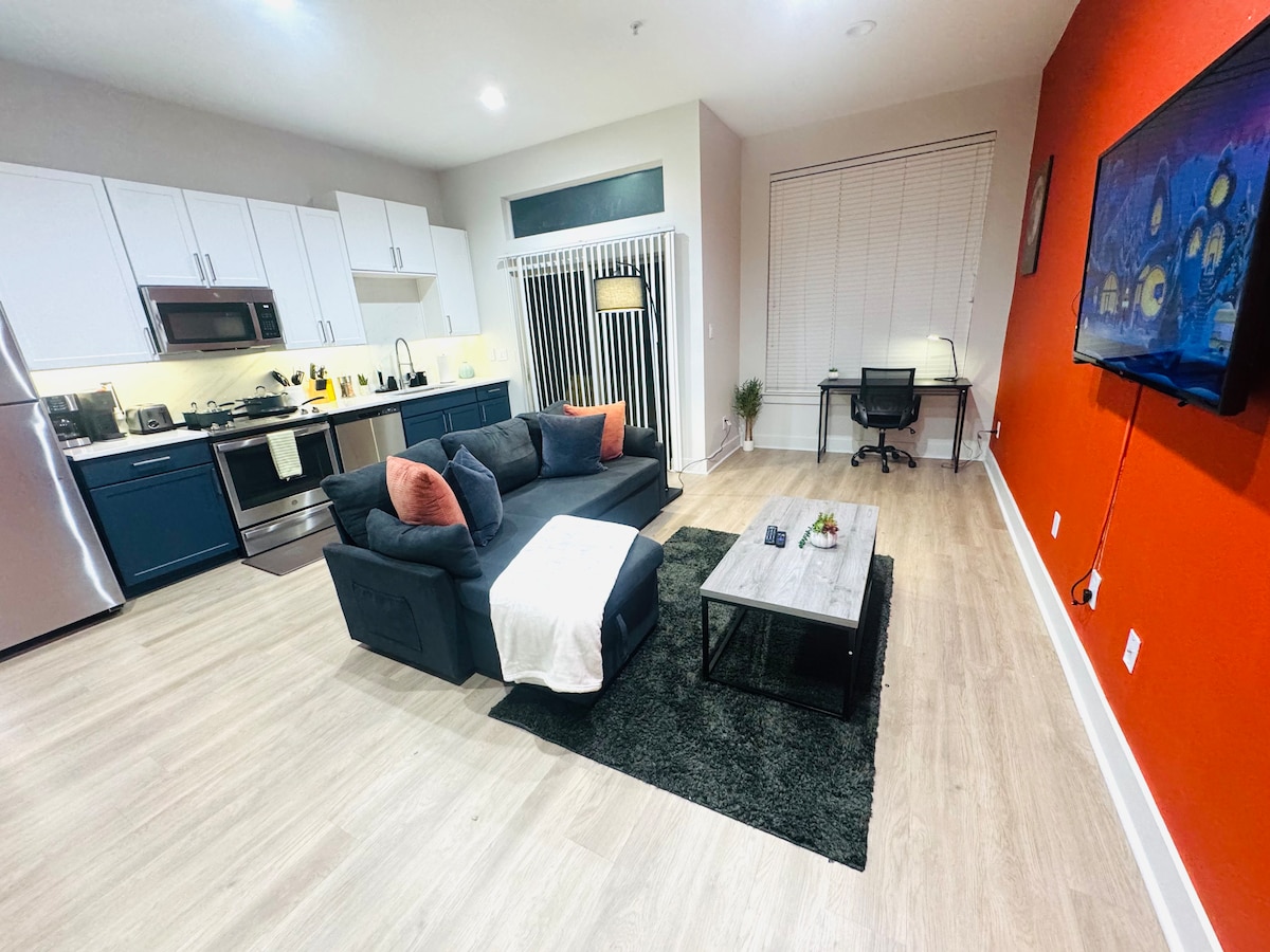 1 chambre moderne au cœur de Deep Ellum ! Profitez d'un espace ouvert élégant avec une cuisine raffinée, des plans de travail en quartz, une télévision connectée et un canapé moelleux. Détendez-vous dans un lit queen confortable et une salle de bain de type spa avec une double vasque. Accédez à pied aux meilleurs bars, salles de concert et restaurants. Comprend le Wi-Fi, une buanderie, un balcon privé et une entrée sans clé. Parfait pour les couples, les voyageurs en solo ou les voyageurs d'affaires à la recherche de confort et de commodité dans l'un des quartiers les plus animés de Dallas.