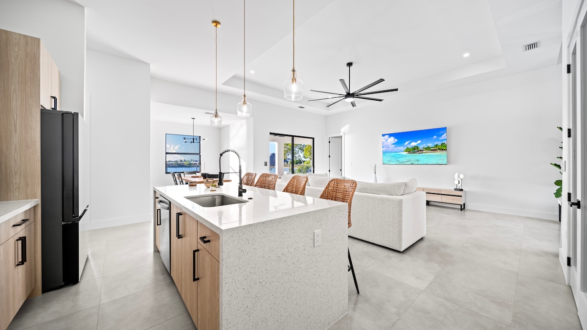 Villa510 est une retraite en bord de mer nouvellement construite, idéale pour les séjours prolongés à Cape Coral. Profitez d'une vue paisible sur le canal salé et les lamantins depuis le lanai, puis détendez-vous dans votre piscine privée chauffée et votre spa, parfaits toute l'année. La cuisine extérieure et le lanai créent une routine quotidienne facile et confortable. L'intérieur offre trois chambres privées avec salle de bains privative, un salon avec matelas pneumatique en option, un espace de vie ouvert et des téléviseurs dans chaque pièce. Proche des magasins, restaurants et plages, parfait pour les amateurs de neige à la recherche de confort et de facilité.