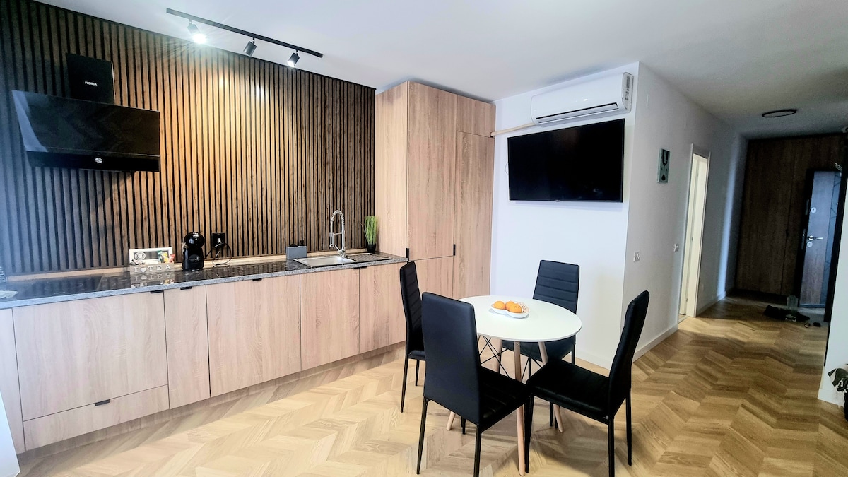 Appartement moderne et confortable situé dans le quartier central de Craiova dans une rue calme, équipé de nouveaux équipements comprenant : une chambre spacieuse équipée d'un lit double, TV, bureau, commode ; un salon avec grande télévision, coin extensible ; un balcon joliment aménagé, une nouvelle salle de bain équipée d'une baignoire ; cuisine entièrement équipée : cuisinière, réfrigérateur, lave-linge, cafetière, hotte, assiettes, tasses, couverts, ustensiles de cuisine, etc. ; un couloir avec un cintre et un dressing. Tous les meubles et équipements sont neufs.