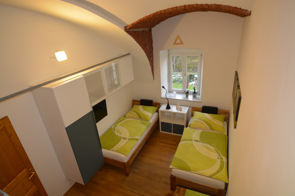 Le "Apartment Erwin" est un bel appartement confortable, joliment décoré et très calme. Entièrement équipé d'une chambre à coucher, d'un coin repas et d'une cuisine et d'une salle de bain privée. Vous avez la possibilité de dormir dans un grand lit double ou dans des lits simples et il y a en plus un lit superposé pour une troisième personne La cuisine est entièrement équipée et bien sûr, vous disposez également de deux téléviseurs à écran plat à LED avec connexion par câble et d'une connexion Wi-Fi gratuite.
