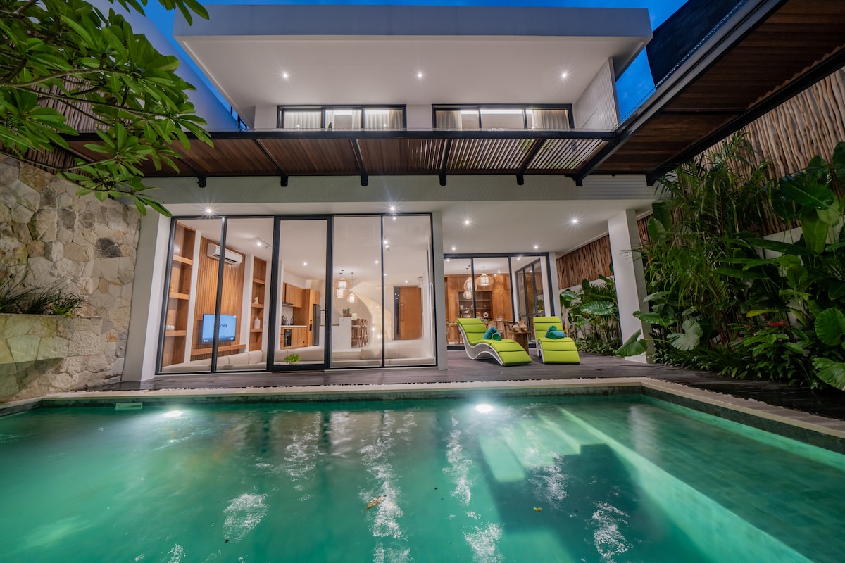 Villa tropicale flambant neuve au cœur de Canggu • 2 chambres climatisées élégantes avec vue sur la jungle • Salles de bain privées avec équipements, chaussons et sèche-cheveux • Grande piscine entourée de verdure pour se détendre et faire des barbecues • Aménagement minimaliste élégant avec cuisine ouverte et salle à manger • Wi-Fi 300 Mbit/s pour le travail ou le streaming • PS5, Netflix sur demande • Lit bébé et chaise haute sur demande • Nettoyage quotidien avec des serviettes et des draps propres. • Service de conciergerie pour les réservations de spa, les scooters, les cours de surf et plus encore