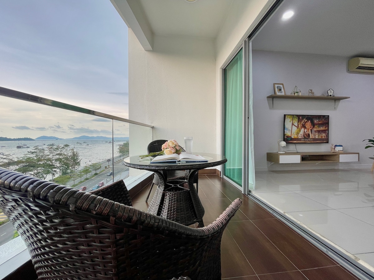 Stunning Sea view from the house. Chilling at the balcony. Swimming pool@level 6 Living Room, Queen Size bedroom, private sofa bed corner with curtains. Ensuite bathroom with hot and cold water shower. Large refrigerator with ice cube , mini kitchen with electric cooker, pot,plate,spoon,fork are available . Light cook at the kitchen. Filter water machine hot and warm. Please select 3 guest if you need single bed setting convert from sofa bed.