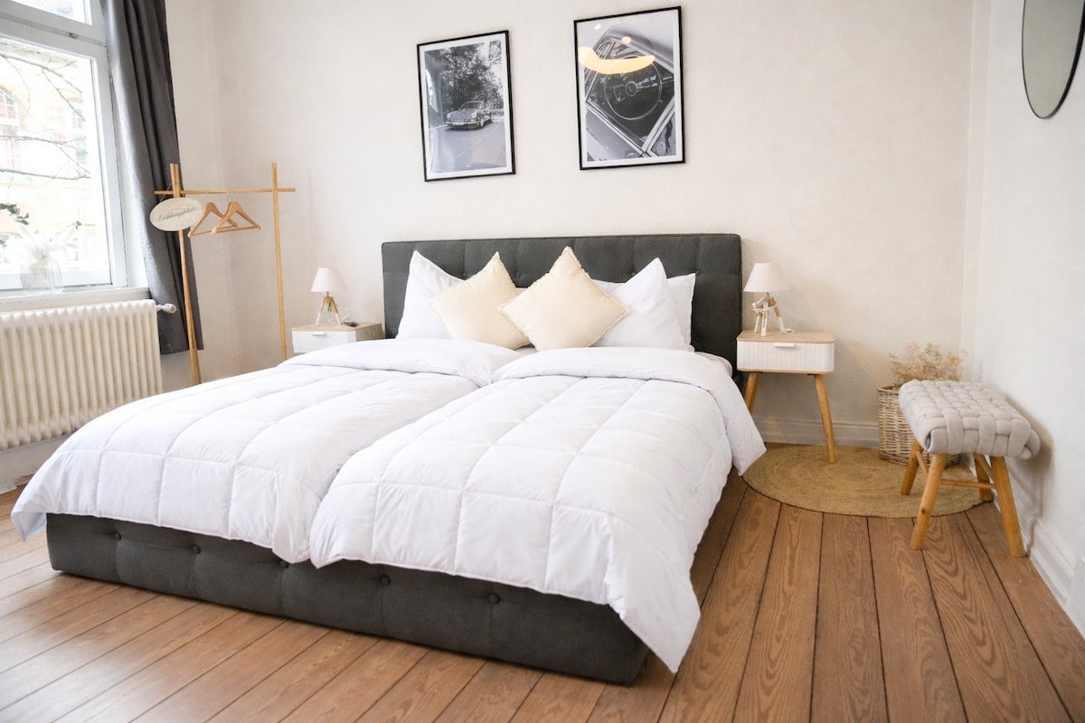 Découvrez un style incomparable à 90 m ² dans la suite Mokka Neumünster, à quelques minutes du centre commercial design, de la gare et des Holstenhallen. Deux chambres avec lits boxspring garantissent des nuits reposantes, la salle de douche dégage un charme moderne avec des accents noirs. Une cuisine entièrement équipée et une télévision connectée assurent un séjour confortable. Parking privé disponible. Emplacement (en minutes) Centre outlet design : 5 Gare : 3 Holstenhallen : 7 Hambourg & Kiel : 35