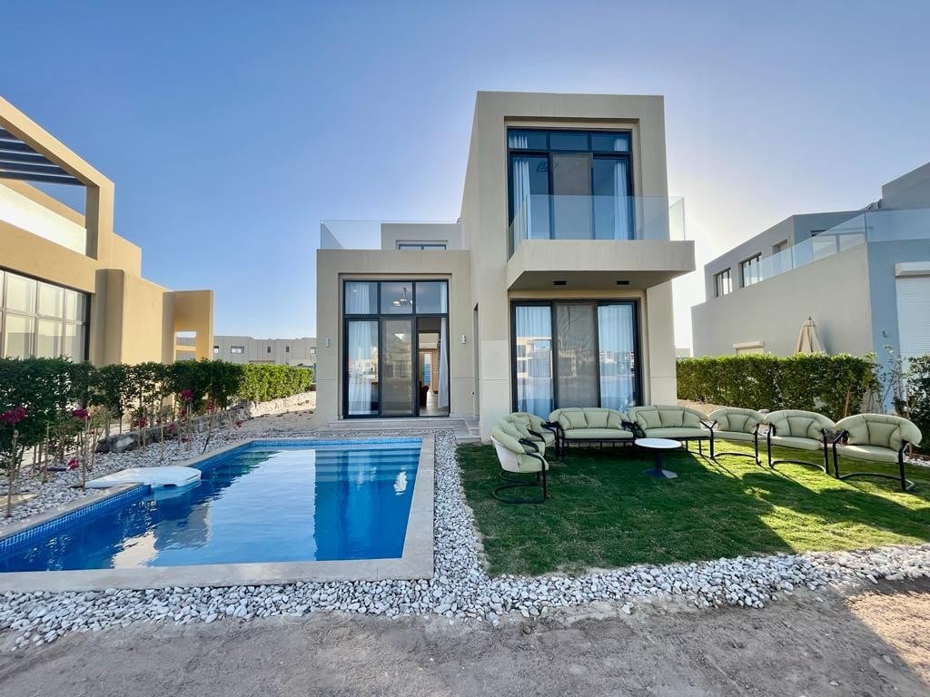 Amazing and Unique in Hurghada, family friendly holiday home or a romantic get away for honeymooners with a large private swimming pool only for you,nothing is shared Spacious livingroom, with open kitchen and toy corner Up, Master bedroom ensuite with shower and a bedroom with kingbed, bunkbed and a Playstation5 Bathroom to fully relax with a big Jacuzzi The villa is fully eqiuped with all what you need We will be honored to welcome you and make your stay amazing and arrange trips for you