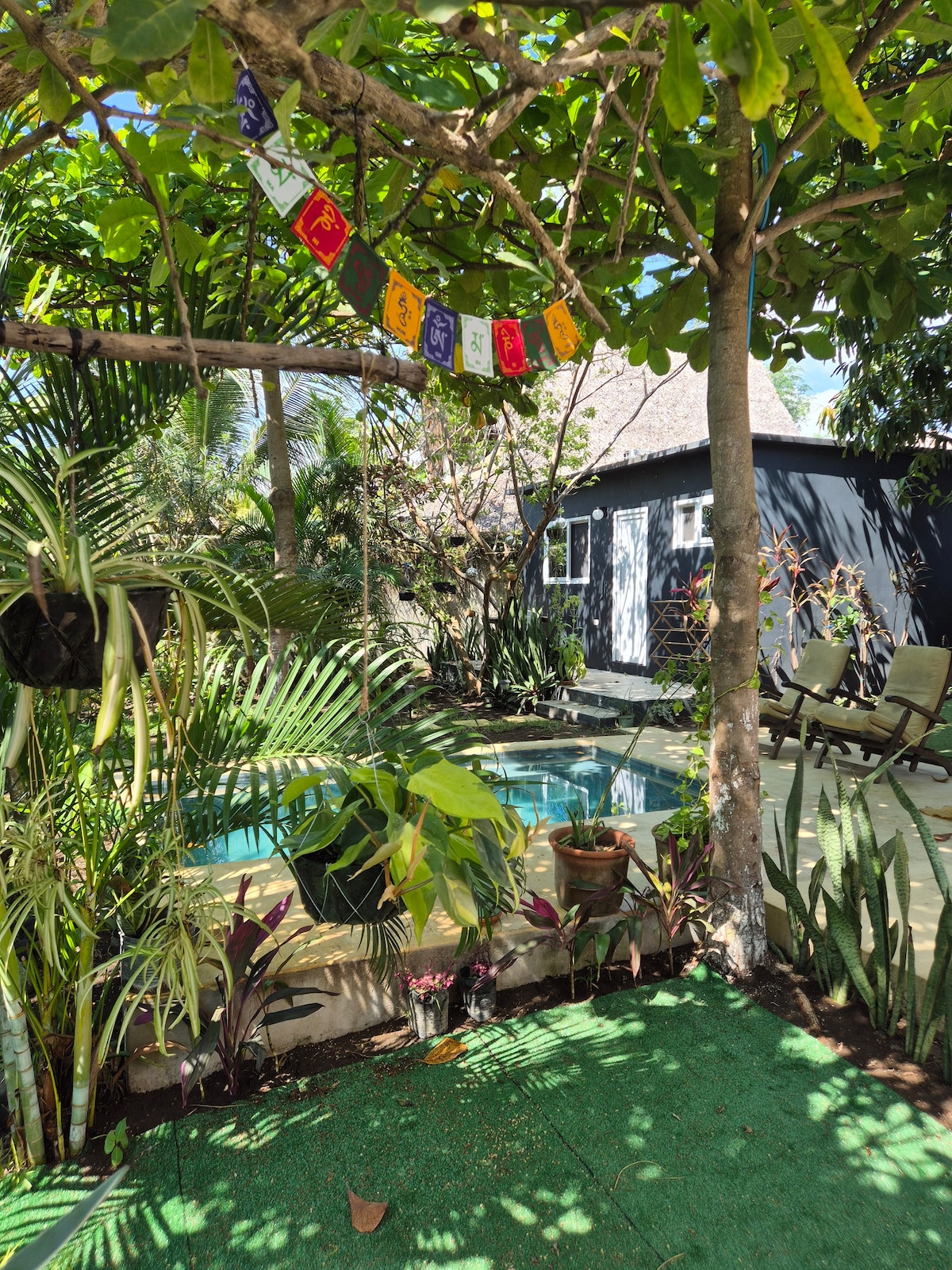 El Nido « le nid » est notre petite maison de plage. Parfait pour un couple. Confortable jusqu'à 3 personnes. Un peu en retrait de la plage, ce bungalow de deux étages est idéalement situé entre le village et les hôtels. À quelques pas du sable noir du Pacifique, notre répit de plage aéré est un cadre idéal pour la détente, le surf, le yoga ou la plongée dans un livre. Tout en plein air permet la brise de l'océan et le deuxième étage couvert de palmiers offre de l'intimité tout en ayant toujours cette sensation d'air libre.
