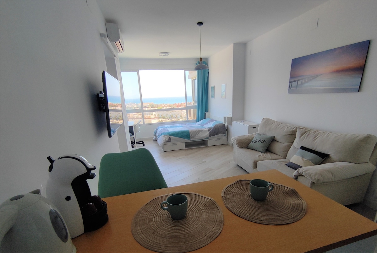 L'appartement est situé dans un immeuble qui dispose d'espaces verts communs et d'une piscine communautaire ouverte uniquement en saison estivale du 23 juin au 21 septembre environ. Il y a un bar à cafétéria dans le complexe, un supermarché et un coiffeur. L'appartement est un studio très agréable, charmant et fonctionnel. Avec une vue imprenable sur la mer. Climatisation et télévision. L'emplacement est privilégié en raison de sa proximité avec la mer (10 min à pied/800 mètres), de l'aéroport, de la gare de banlieue et des autoroutes.