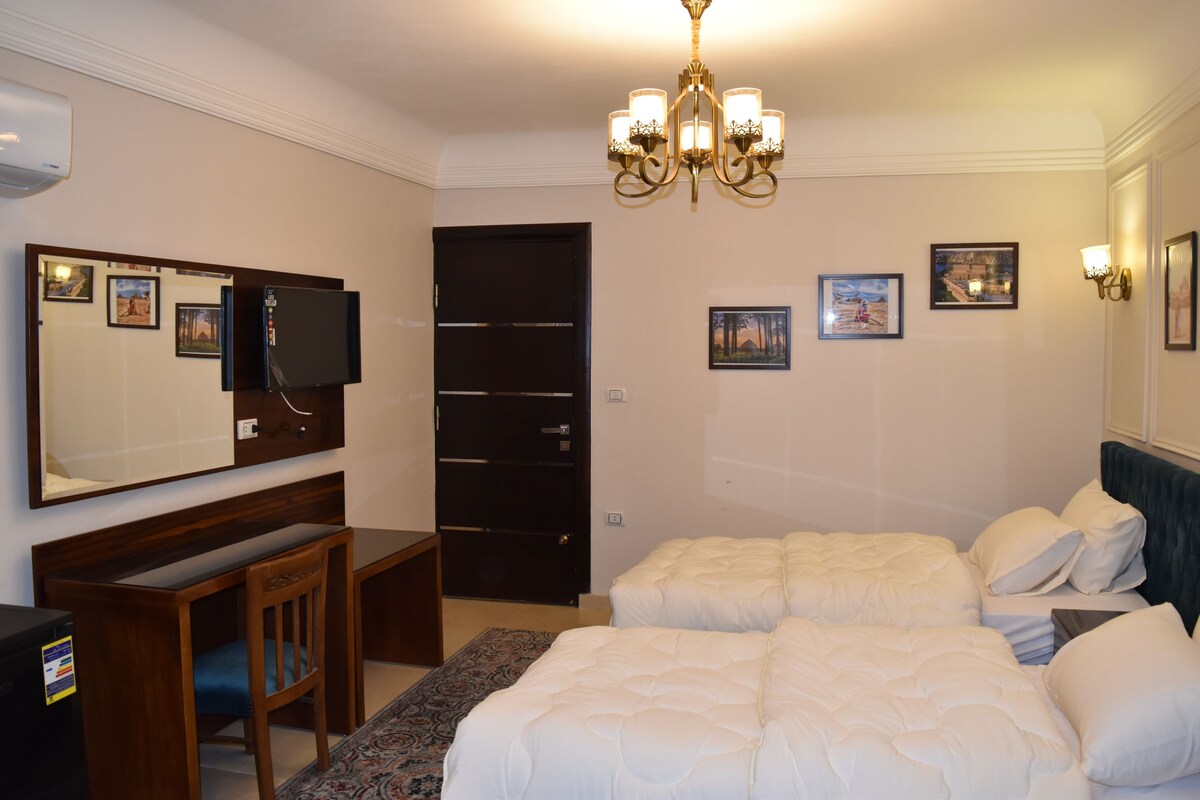 Bienvenue dans votre retraite de rêve au cœur de l'Égypte ancienne. Nichée à quelques minutes des pyramides emblématiques de Gizeh, notre chambre de luxe offre une expérience vraiment unique et inoubliable.