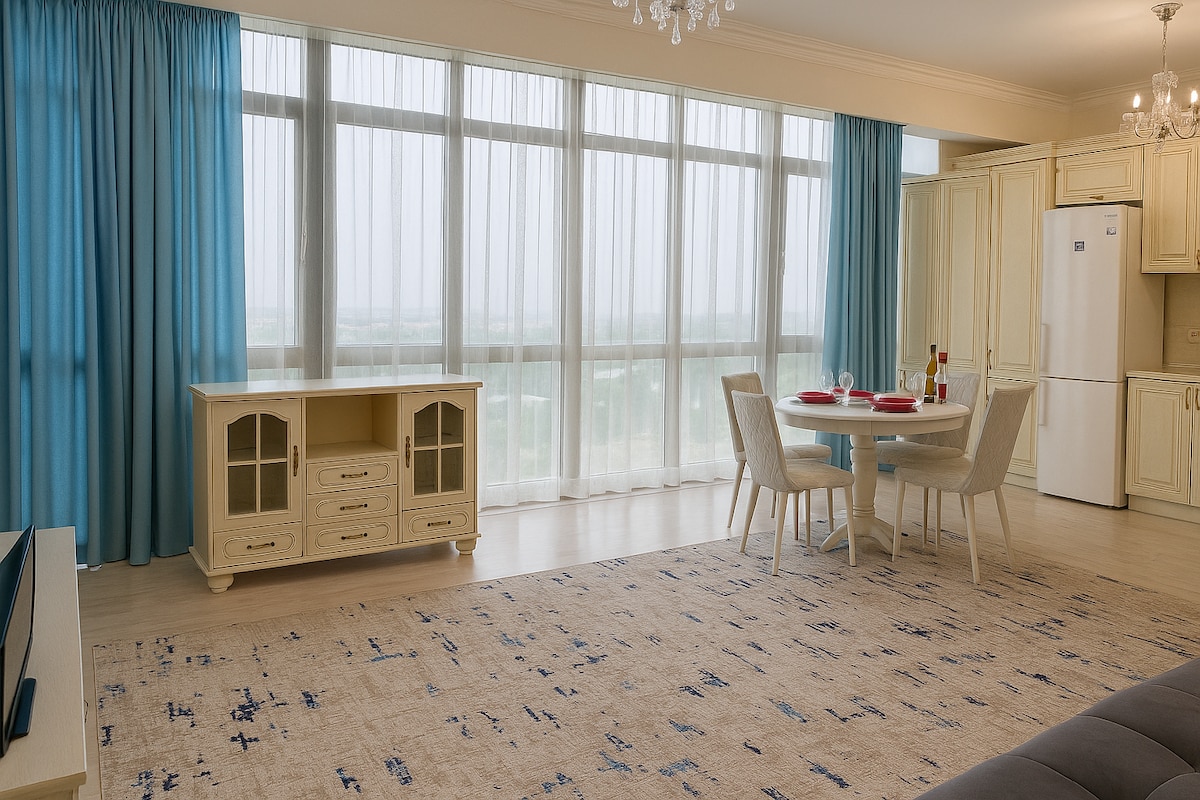 Profitez de votre séjour dans le centre-ville avec une vue panoramique sur les montagnes de Zailiyskiy Alatau. Appartement élégant dans le complexe résidentiel de classe affaires Arbat, situé dans le centre historique de notre ville.