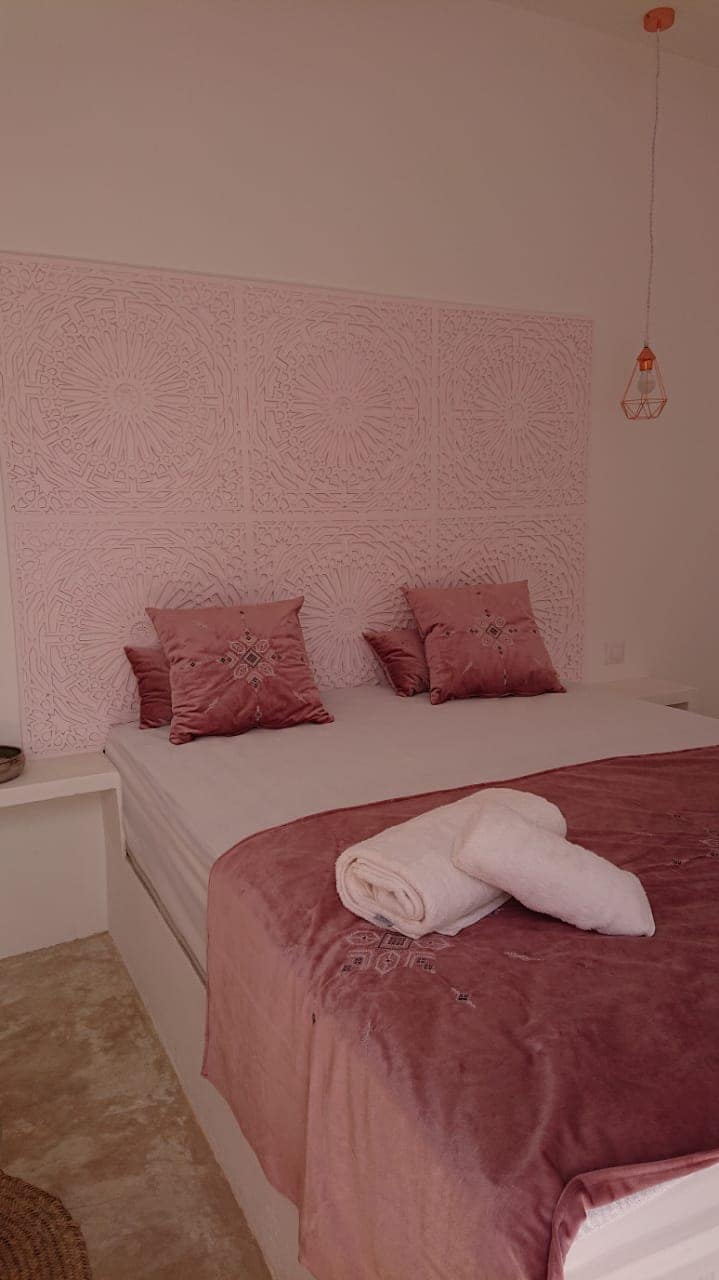 Centre ancienne Médina. Confortable chambre de 20m2 avec salle de bain et wc. Lit 180 ou lits jumeaux 2x90. Couette, peignoirs, shampoing corps et cheveux, savon. Petit déjeuner/brunch inclus. Wifi. Au 1er étage d'un riad décoré avec soin et originalité offrant 2 confortables salons, salle à manger, Le plus: vaste terrasse aménagée, sans vis à vis surplombée d'une cabane offrant une vue panoramique sur la médina et la mer. Adresse intimiste, 2 chambres seulement à la location.