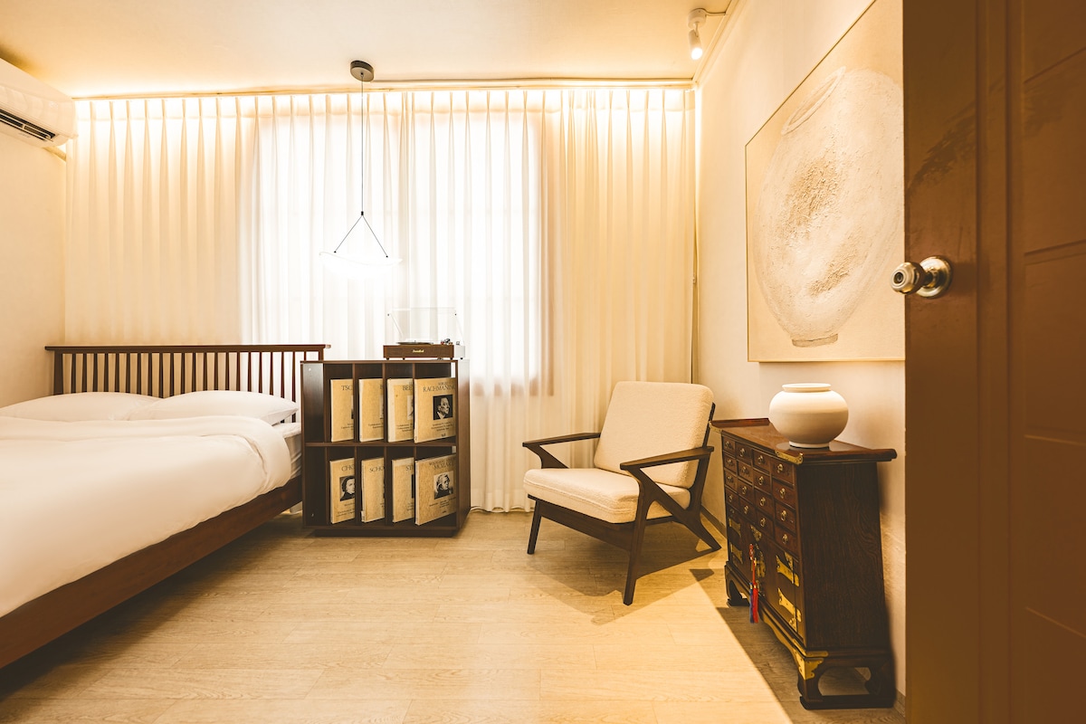 Bienvenue chez moi ! Parfait pour ceux qui apprécient l'élégance et préfèrent une touche de luxe aux hôtels économiques. Avec des décorations de bon goût, des meubles, un éclairage d'ambiance et un système audio de haute qualité, vous trouverez confort et facilité dans un espace qui respire le style sans être trop glamour ou flashy. Ne convient pas aux familles avec enfants de moins de 10 ans en raison de meubles fragiles. Vous apprécierez également l'emplacement privilégié à proximité de Seongsu-dong, du parc forestier de Séoul et des principales stations de métro. Bienvenue !