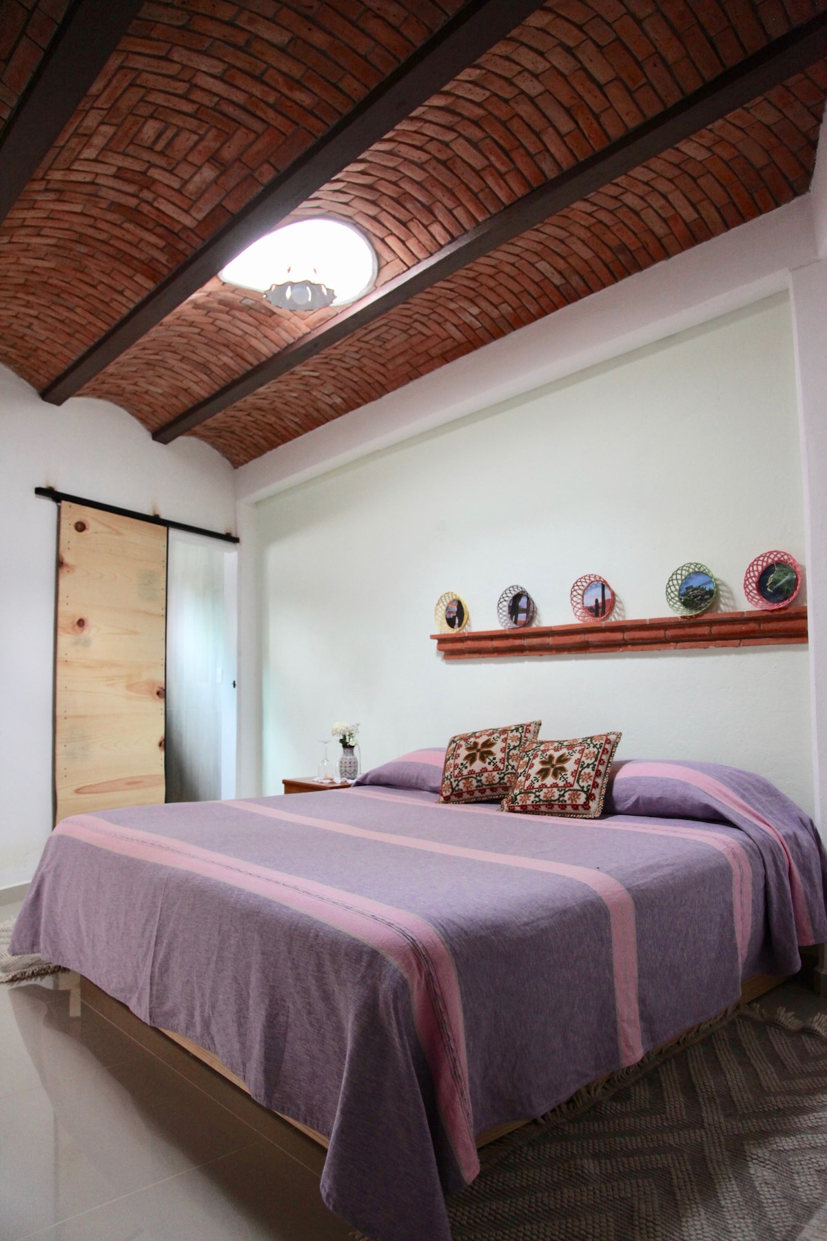 Chambre avec entrée indépendante, elle donne sur les jardins et la piscine, ses fenêtres vous permettront de voir le lever du soleil avec des ballons aérostatiques. Idéale pour les couples avec des animaux de compagnie en raison de son espace et de sa proximité avec le jardin principal, elle dispose d'un lit King size, d'une salle de bain complète, d'un ventilateur et d'un salon. Vous vous sentirez dans une maison de campagne traditionnelle avec un folklore mexicain, la distribution de la maison équilibre les espaces partagés des espaces privés entre les jardins entièrement équipés.