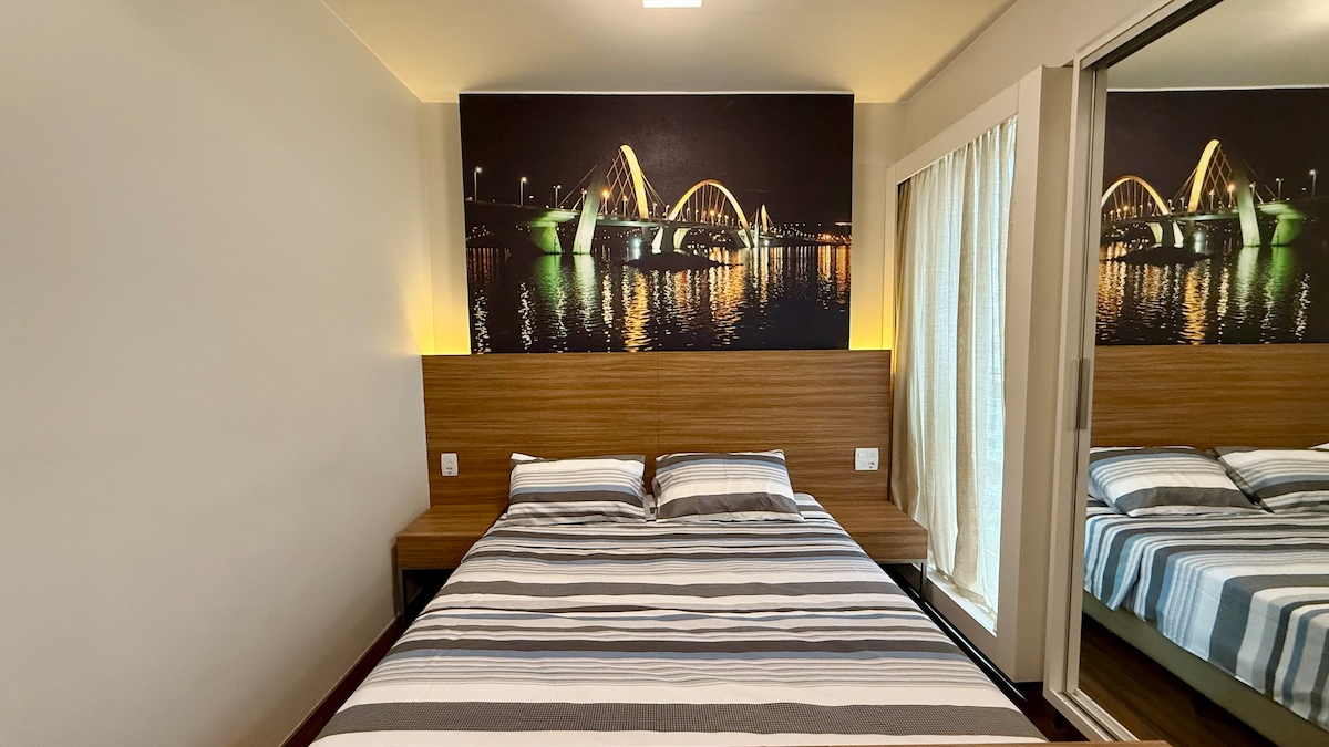 Séjournez dans un endroit sophistiqué, à proximité de tout ce que vous souhaitez visiter. Appartement complet et confortable, situé dans le Setor Hoteleiro Norte, au centre de Brasilia, à proximité des principaux sites touristiques de la ville ! L'appartement dispose d'un lit double, d'un sèche-cheveux, d'un four, d'un fer à repasser, d'une bouilloire électrique et bien plus encore.