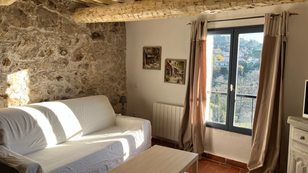 Beau studio meublé 21m² avec salle d'eau-WC, en rez de jardin d'une villa, avec terrasse privée 16m², dans village pittoresque du centre Var, à 30 km du bord de mer et des Gorges du Verdon. Cuisine intégrée et très bien équipée, lit 2 personnes 140x190, canapé 2 places convertible en méridienne ou en lit 1 place pour enfant. TV TNT SAT. Climatisation. Lave-linge et Lave-vaisselle, multiples équipements et produits fournis. Non fumeur / Pas d'animaux. Classement 2 étoiles aux Gîtes de France.