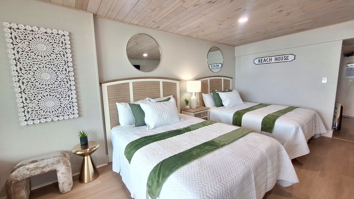 Situé à seulement quelques pâtés de maisons de la plage, venez vous détendre avec une vue sur notre piscine extérieure saisonnière rafraîchissante dans cette chambre avec lit king size. Une décoration rétro et des équipements modernes accentuent cette chambre confortable. Profitez de la commodité d'avoir un micro-ondes, un mini-réfrigérateur et une cafetière à votre disposition, ainsi que des ports de recharge USB, une connexion Wi-Fi gratuite et une télévision à écran plat ! Nous sommes impatients de vous accueillir à la plage avec nous ! **Remarque : âge minimum de 21 ans requis pour la location de ce logement