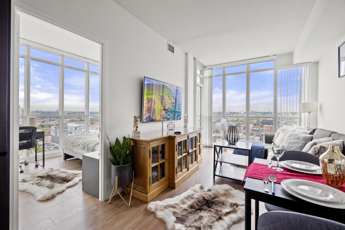 Bienvenue au Fort York Flat ! Cet espace de 2 chambres et 1 salle de bain a été rénové avec soin en utilisant un mélange de décor moderne et contemporain pour créer un endroit relaxant et haut de gamme pour se détendre tout en profitant de tout ce que le centre-ville de Toronto a à offrir. Notre emplacement et notre boîte à clé intelligente située à l'entrée rendent l'enregistrement dans l'appartement plus facile que jamais, pas besoin de s'inquiéter de s'occuper du personnel de la réception ou d'attendre les ascenseurs.