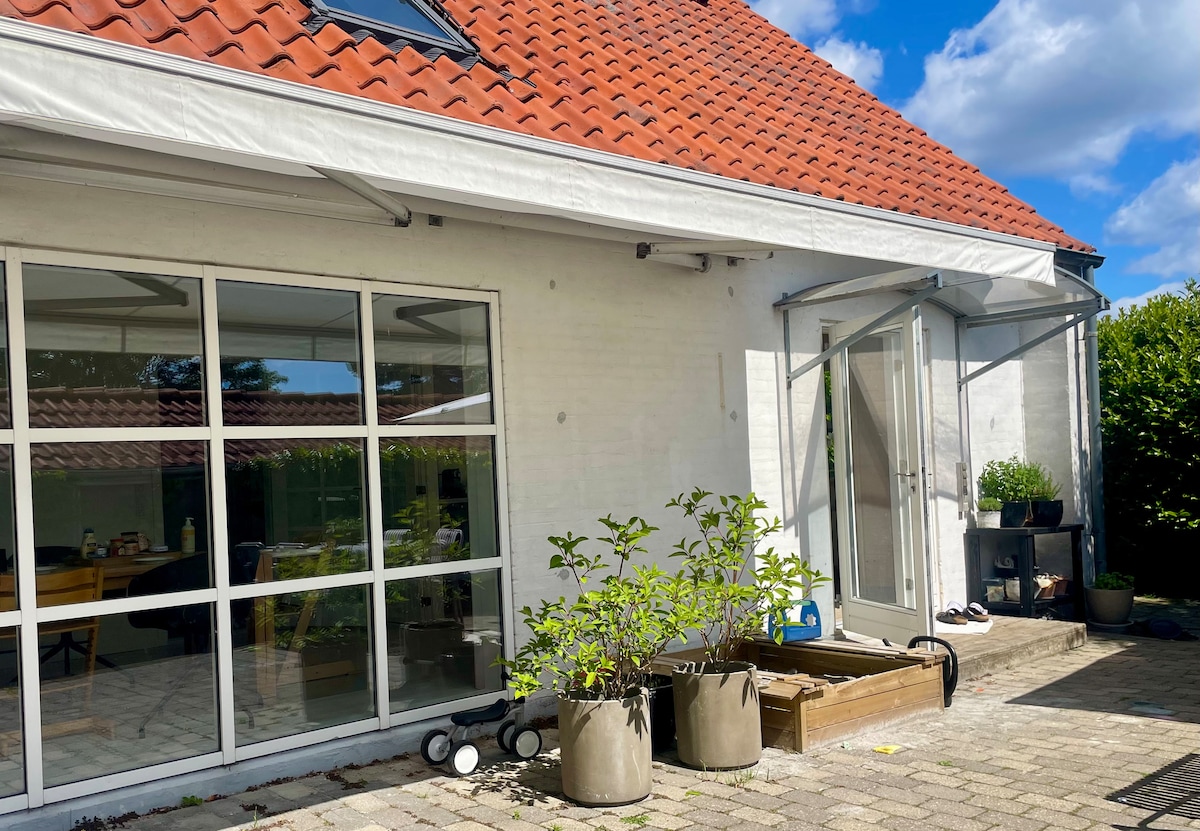 Belle maison d'hôtes avec jardin partagé. La maison d'environ 45 m ² se compose d'un salon, d'une chambre, d'une petite cuisine, ainsi que de toilettes et baignoire. Dans le jardin, vous pourrez profiter du temps danois toute la journée ou faire des activités sur la grande pelouse. 450 m. Pour faire du shopping À 1,5 km. Au plus petit centre commercial À 1,5 km. À la gare 2 km. À la plage 3 km. To Louisiana Museum