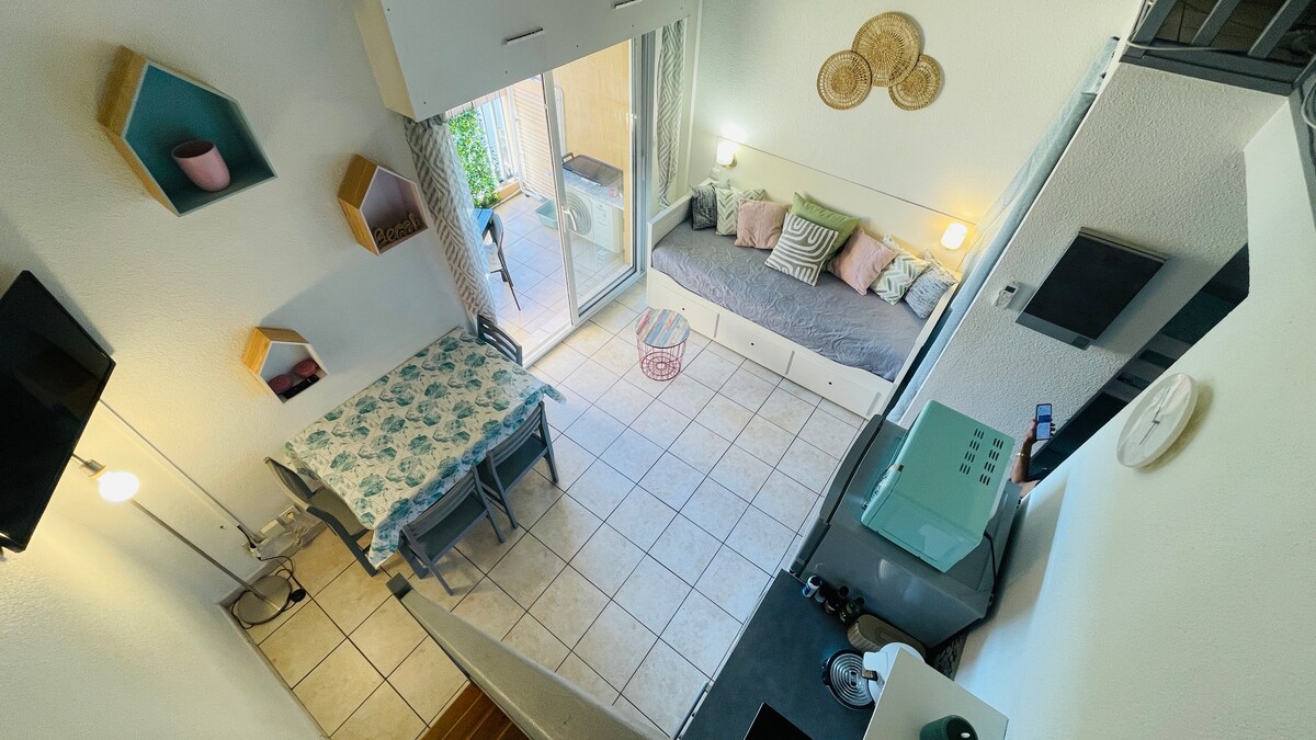 Studio cabine climatisé à 1 minute de la plage