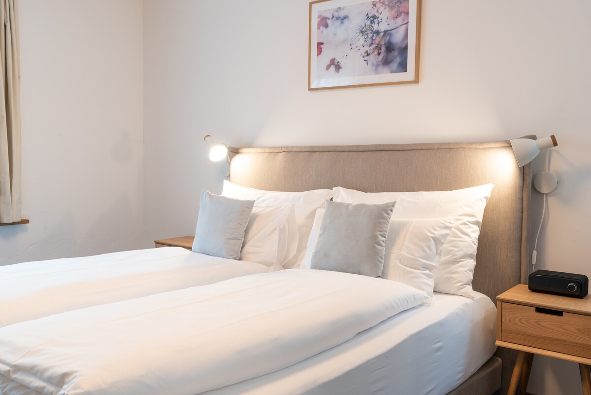 L'appartement de style scandinave dispose de deux chambres séparées, d'un salon avec deux places de couchage supplémentaires ainsi que d'une cuisine entièrement équipée avec coin repas et d'une grande terrasse donnant sur le lac Thun et la chaîne alpine. Deux salles de bains séparées avec toilettes séparées ainsi qu'une douche et une baignoire offrent également un haut niveau de confort pour plusieurs personnes. Les services de l'hôtel sont entièrement à la disposition des hôtes et complètent l'offre.