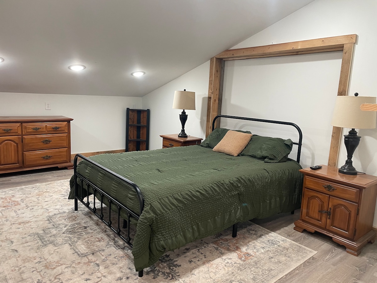 Oubliez vos soucis dans cet espace privé et serein. L'appartement inférieur d'une chambre vient d'être rénové, une nouvelle salle de bain, un revêtement de sol, des cloisons sèches et de la peinture. Porche fermé avec votre véhicule garé juste devant la porte. Le séjour dispose de Futon avec un bureau et une chaise pour un espace de travail confortable. Grande cuisine champêtre équipée de tout ce dont vous avez besoin pour cuisiner des repas. Des en-cas sont inclus. Il y a également une cheminée murale. La chambre dispose d'un lit queen, d'une commode et d'un placard.