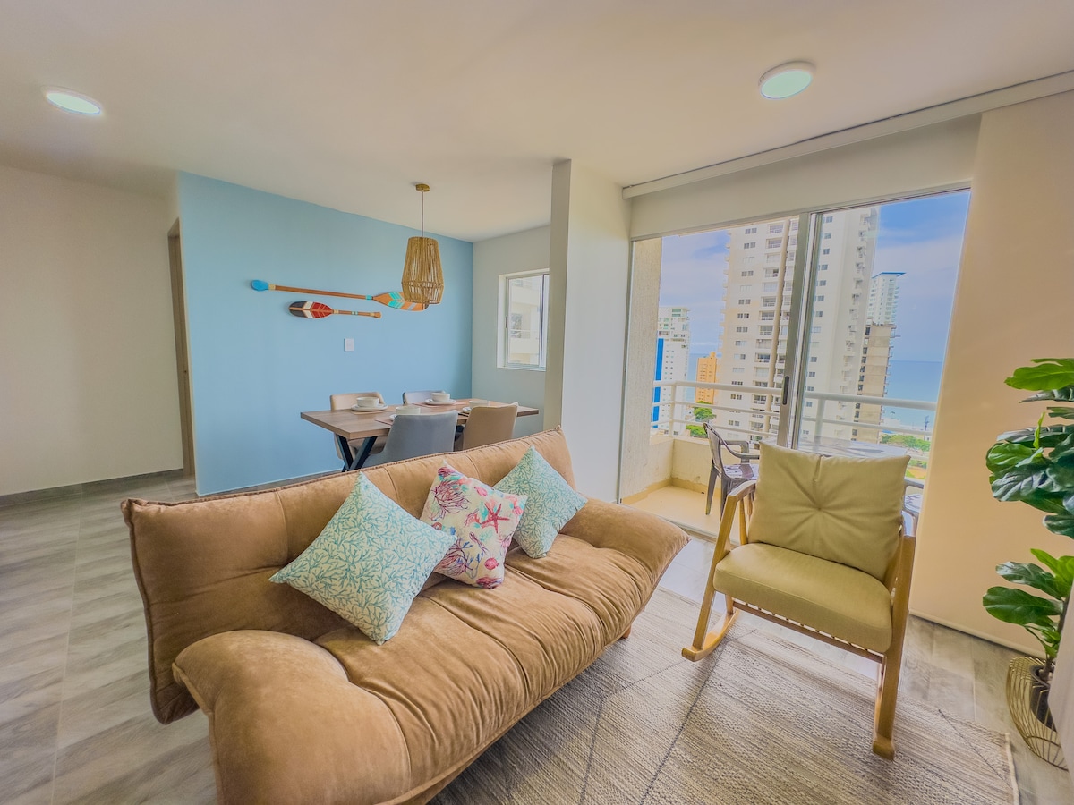 Amplio y bello apartamento de dos alcobas frente al mar, a 5 minutos del aeropuerto y del centro histórico. Nuestro apartamento es el lugar ideal para descansar y conocer la ciudad ya que su ubicación es muy central, cerca de todo. El apartamento esta completamente dotado para que te sientas como en tu casa. Adicionalmente, el edificio cuenta con hermosas áreas sociales: piscina de adultos y de niños, jacuzzis, sauna, turco, parque de juegos, gimnasio, etc. Y tiene seguridad las 24 hs. del día.