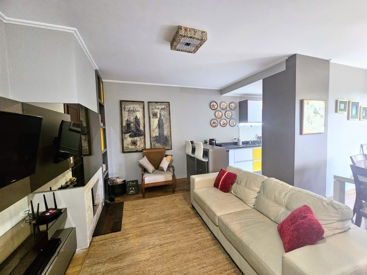 Appartement Aconchegante de 2 chambres dans l'un des quartiers les plus nobles de la ville, à proximité du centre et des principaux sites touristiques. Equipado et décoré conformément au style de la Serra Gaúcha. Il dispose d'une connexion Wi-Fi, d'une télévision connectée, d'un chauffage au gaz et électrique, d'une cheminée, d'un barbecue, d'un lave-linge/sèche-linge, de la climatisation, d'une cuisine, d'un lit complet et d'une salle de bain, d'un garage, de tout de bonne qualité dans un endroit calme et boisé et idéal pour les familles à la recherche de confort et de tranquillité. Horaires d'arrivée et de départ flexibles.