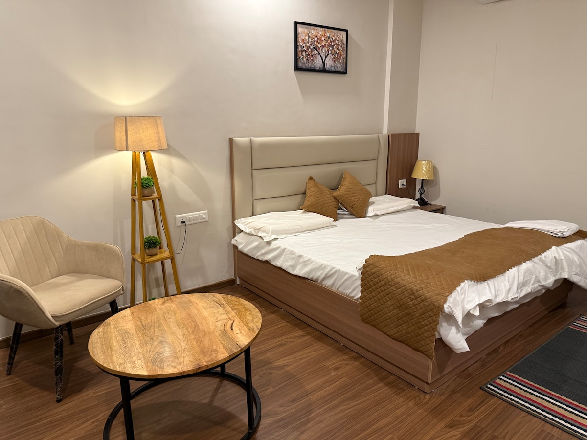 Détendez-vous dans ce studio calme et luxueux avec la chaleur de la maison et l'ambiance d'un hôtel haut de gamme. Meublé avec un lit King Size moelleux et un décor moderne. Équipements : Épicerie ouverte 24h/24 Kitchenette moderne WiFi et télévision haut débit Stationnement sécurisé à l'extérieur de la tour mais sécurisé 24h/24 et 7j/7 Les 2 premiers étages ont des magasins commerciaux, offrant : Services de blanchisserie Salon Café Magasin médical Accès facile à l'India Expo Mart, circuit international de Bouddh. Parfait pour les couples, les voyageurs en solo ou les partenaires commerciaux.
