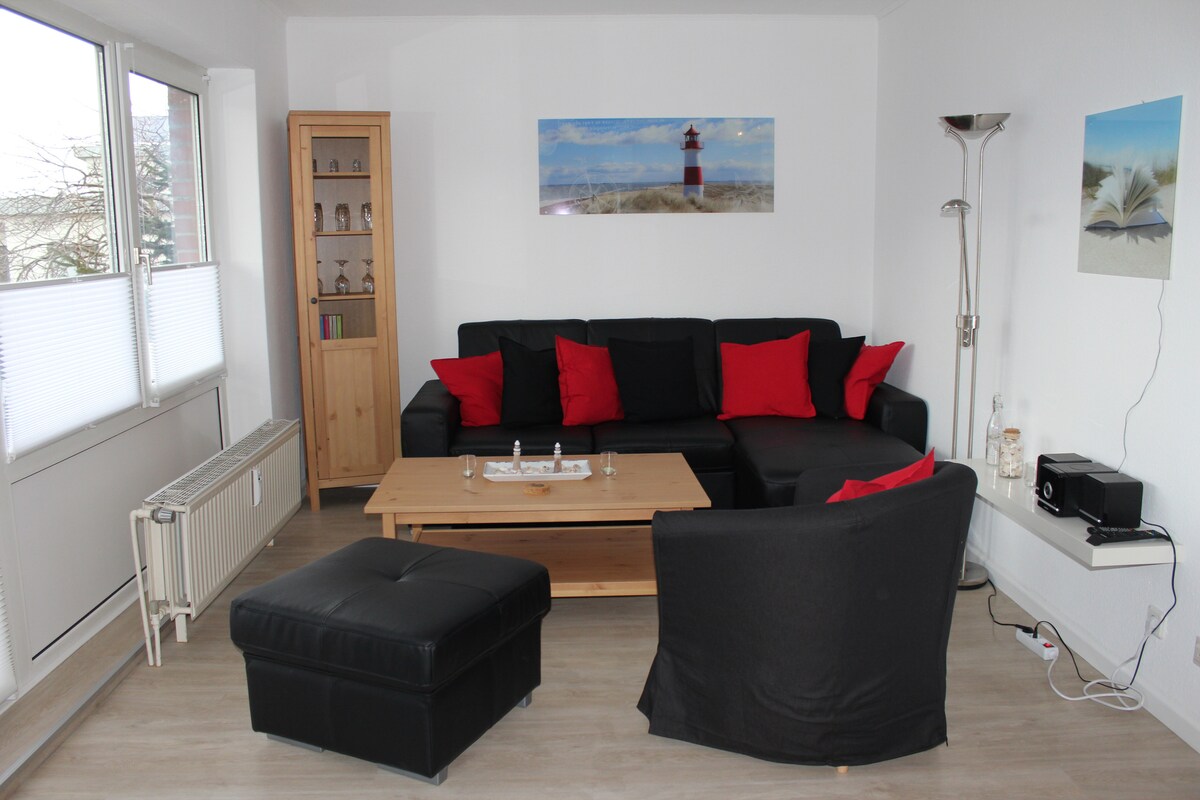 Bel appartement lumineux avec balcon et vue sur la mer et la jetée. Au 4ème étage du Grömitz - Center. Un ascenseur est disponible. 4 marches doivent être franchies. 2 chambres séparées, salon / salle à manger éclairé et confortable, petite cuisine Salle de bain Un parking souterrain dans l'immeuble fait partie de l'appartement. Hauteur de passage : 2 mètres ! La plage, le parc aquatique, la boulangerie et tous les autres magasins sont rapidement accessibles.