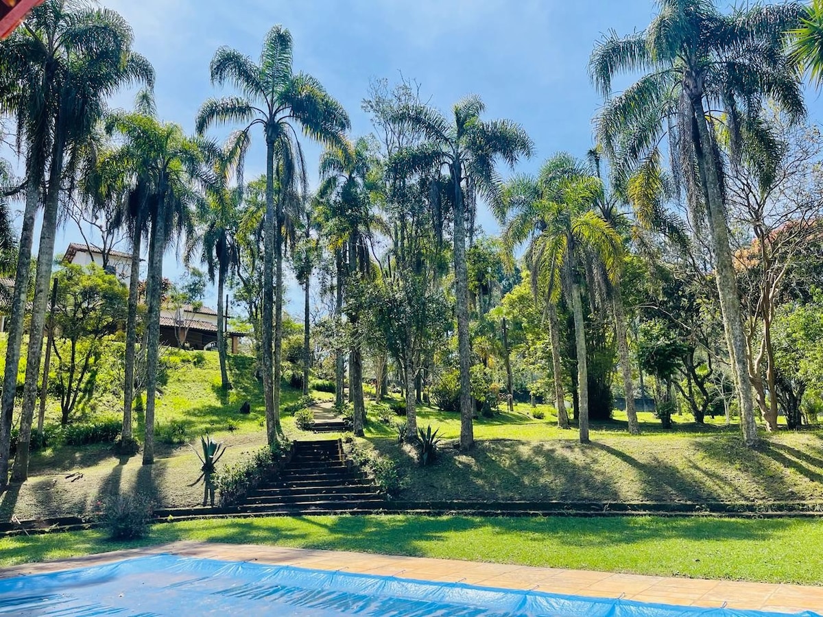 Nous acceptons les ANIMAUX DE COMPAGNIE ! Nous avons 2 500 m2 de beau jardin dans la belle Chacara dans une copropriété fermée. Sur la propriété, une grande piscine privée climatisée avec système solaire et plage. Barbecue, 5 chambres (2 suites), wifi. À seulement 30 km de la capitale de São Paulo. La copropriété s'appelle Skorpios Village II (haut standing), a un paysage de lacs charmants, réserve forestière atlantique. La maison est au rez-de-chaussée, pleine de vie (oiseaux, grands arbres, plantes exotiques et, si vous avez de la chance, vous verrez de belles orchidées dans le jardin).