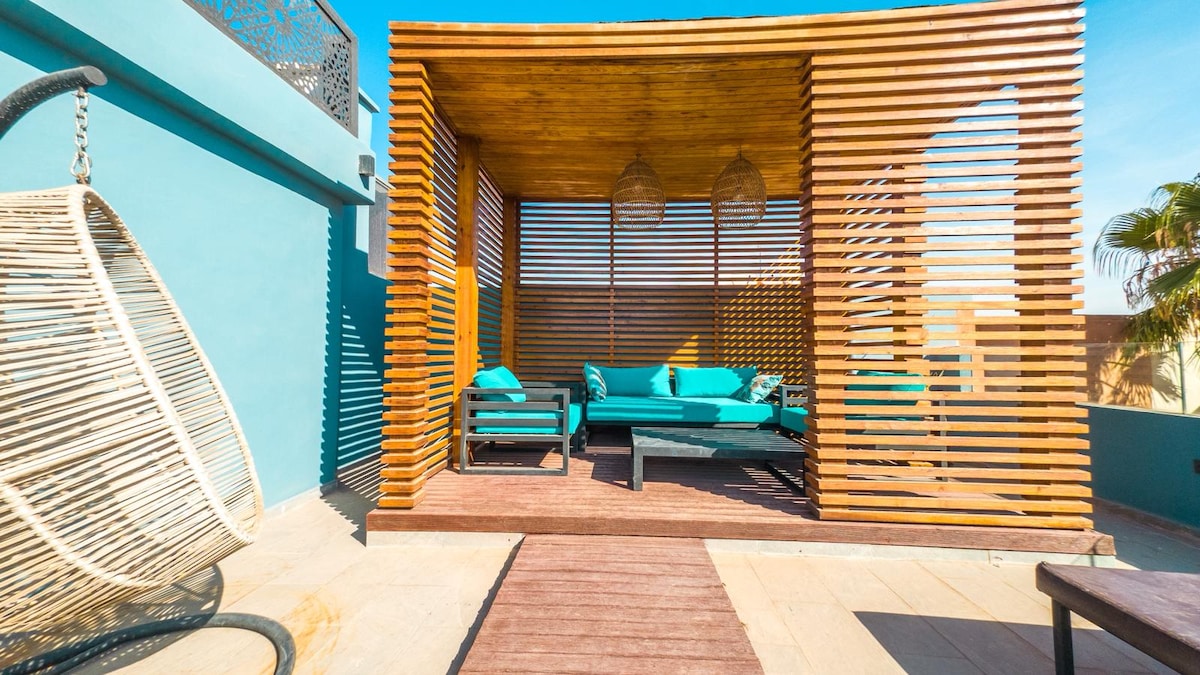 Appartement d'une chambre avec grande terrasse, refait à neuf et décoré avec goût dans un esprit beldi chic, au cinquième et dernier étage avec ascenseur d'une résidence sécurisée et très bien entretenue avec gardien à Guéliz. A deux pas du Café de la Poste, café mythique des années 20, et à 250m du Carré Eden, cet appartement a le meilleur emplacement. Il se trouve dans une rue calme, en face de la Trésorerie Générale du Royaume, ce qui permet de profiter de la terrasse et de la vue dégagée