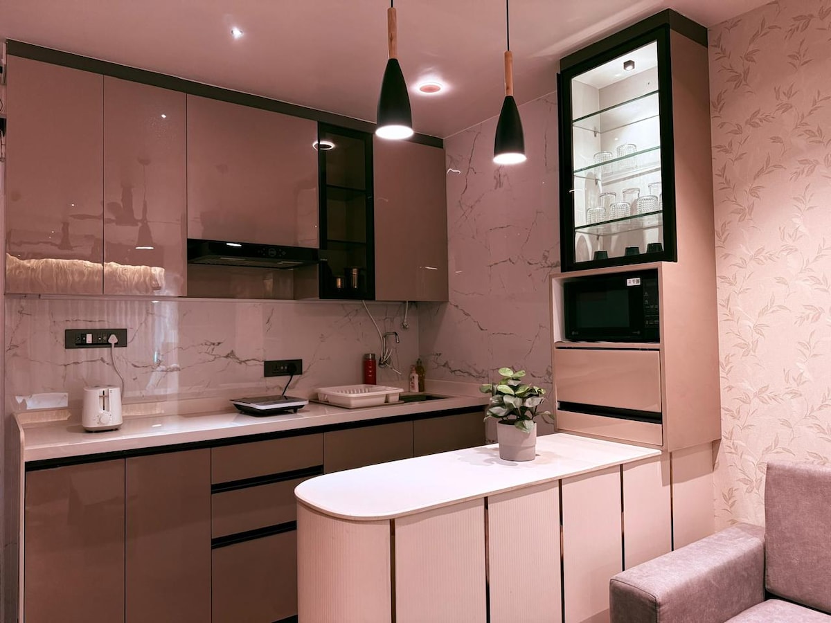 Nest 2 (1BHK AC Suite) 31e étage vue splendide sur les montagnes. #Espace de vie : Climatisation Télévision 4KHD connectée 56 pouces 🎶 Expérience musicale Alexa ECO Livres, cartes et Ludo Canapé-lit queen size cum Table de salle à manger/bureau avec chaises Connexion internet haut débit. Balcon #Kitchenette : Four à micro-ondes Plaque d'induction Bouilloire 🔥 Grille pain Presse française Articles de cuisine Crockeries Tasses à café Complémentaires #Chambre Chambre Climatisation Lit queen size avec tables de chevet Miroir d'habillage Armoire Balcon