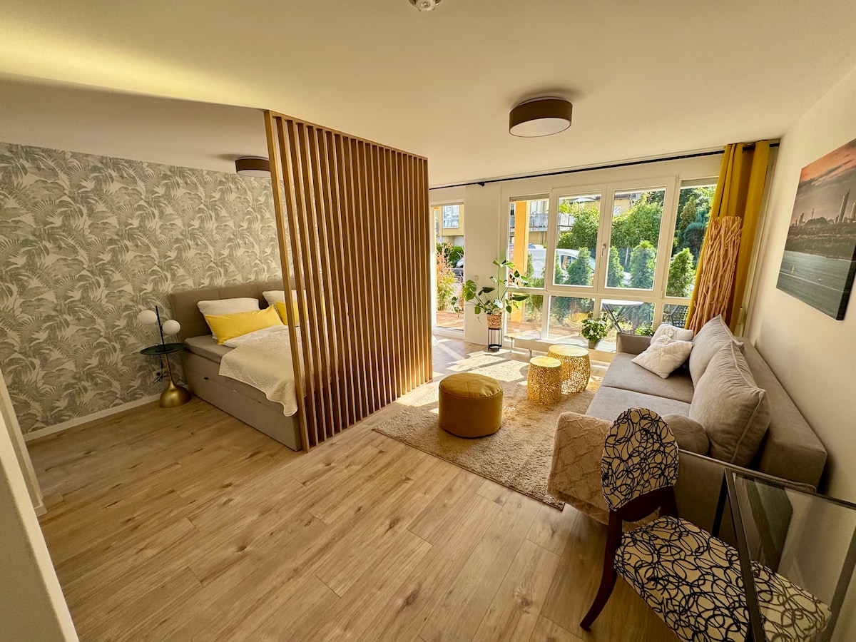 Petit mais très bien - appartement joliment décoré près du lac. Boulangerie traditionnelle et commerces au coin de la rue. Un appartement ouvert (une seule porte qui délimite la salle de bain) et une cuisine entièrement équipée avec balcon attenant t'attendaient, sur lequel tu pourras déguster confortablement ton café du matin ou terminer ta soirée. Un lit boxspring confortable vous invite à rêver et vous pouvez également supporter quelques nuits sur le canapé du salon.