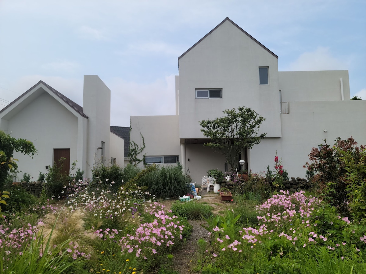 Il s'agit d'une maison unifamiliale située à Hangyeong-myeon, Jeju-si. Seul le deuxième étage de la maison individuelle indiquée sur la photo peut être utilisé en privé, et il y a un escalier extérieur séparé, qui peut être utilisé exclusivement pour les voyageurs. La belle grande salle d'événement au deuxième étage est métaphorique, de sorte que vous pouvez faire la fête ensemble, en créant une atmosphère de café où vous pouvez prendre un verre ou un café tout en profitant du paysage extérieur. Le nombre maximal de voyageurs est de 5, En juillet et août, le tarif de haute saison sera appliqué. Nonghyup Hanaro Mart, Jeoji Oreum, Sinchang Windmill Coastal Park et Panpo-gu sont à proximité de l'auberge, et Suwolbong, Hyeopjae Beach, Geumneung Beach, Bicheolrin, Hwansang Forest et Thinking Garden sont situés à environ 10 minutes. Et Osulloc, Gotjawal, Jeju Olle Trail 12, 13 cours, Camellia Hill, Shinhwa Theme Park et International English School sont également situés à proximité. Vous pouvez également creuser et goûter les cultures cultivées dans le jardin en fonction de la saison.