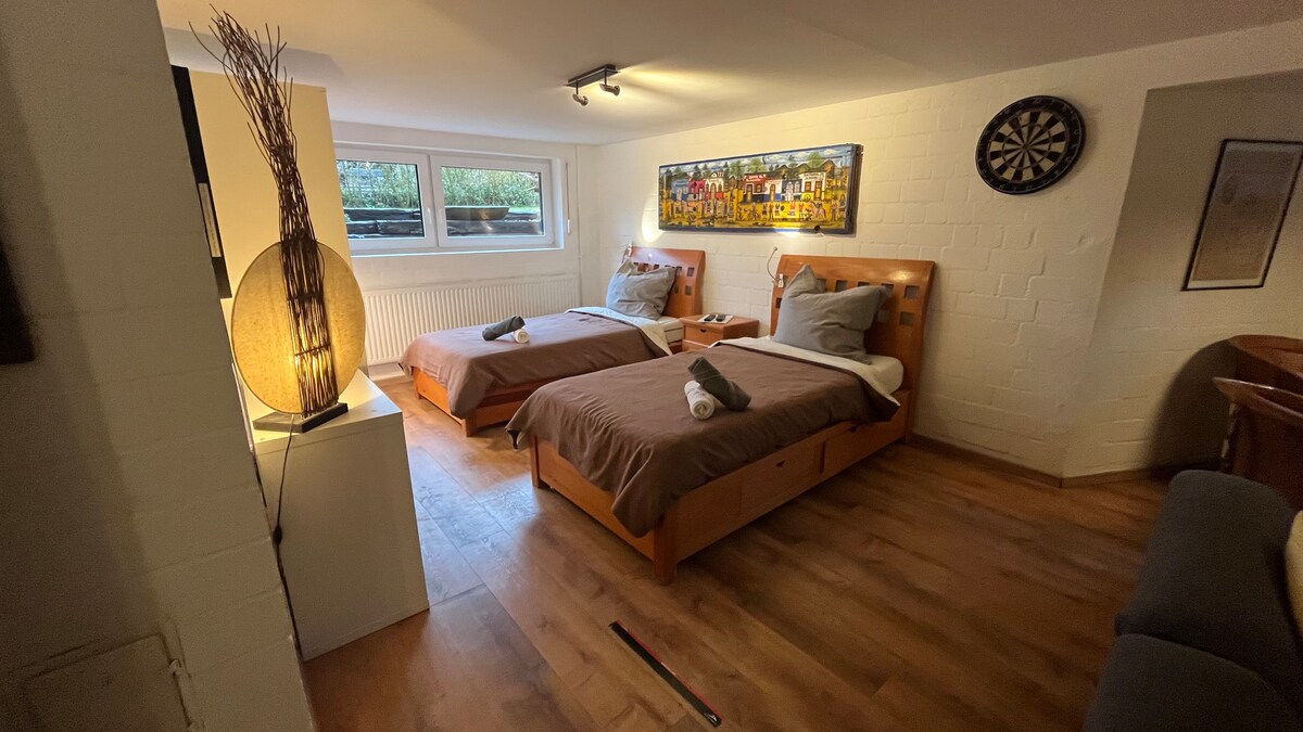 Bienvenue dans notre appartement confortable en sous-sol dans une maison individuelle ! Vous y profiterez d'un séjour paisible et reposant à la lisière de la forêt de Klövensteen. L'appartement dispose de 4 lits confortables et d'une entrée séparée qui vous permet d'avoir de l'intimité et de l'indépendance. Dans la cuisine entièrement équipée, vous trouverez tout. - Réfrigérateur (3 compartiments congélateur) -Micro-ondes - Lave-vaisselle - Salle de bain privée - Sensation cinéma : TV 65 pouces I Netflix - Grande table de billard - Jeu de fléchettes