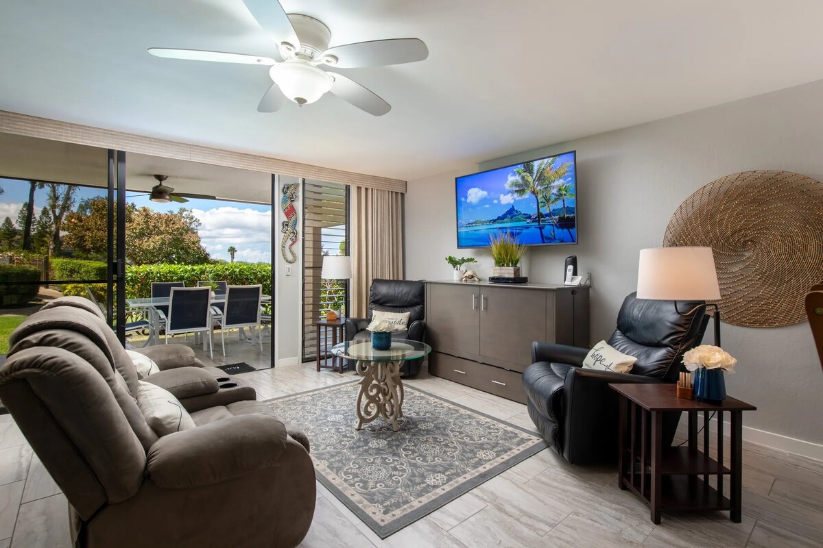 Profitez de votre séjour dans ce logement en copropriété serein au rez-de-chaussée, rénové en 2023, avec 1 chambre et 1 salle de bain, dans l'un des meilleurs emplacements de Waikoloa Beach Resort. * Aménagement paysager tropical luxuriant avec étangs et cascades * À côté de la piscine, du court de tennis, du barbecue et du centre de fitness. * À distance de marche de la plage, des boutiques, des restaurants, des divertissements et du Grand Hilton. * WiFi rapide gratuit. Climatisation centrale. Lave-linge et sèche-linge. * Téléviseurs Spectrum Cable et Roku streaming * Parking privé à 50 mètres de la porte d'entrée.