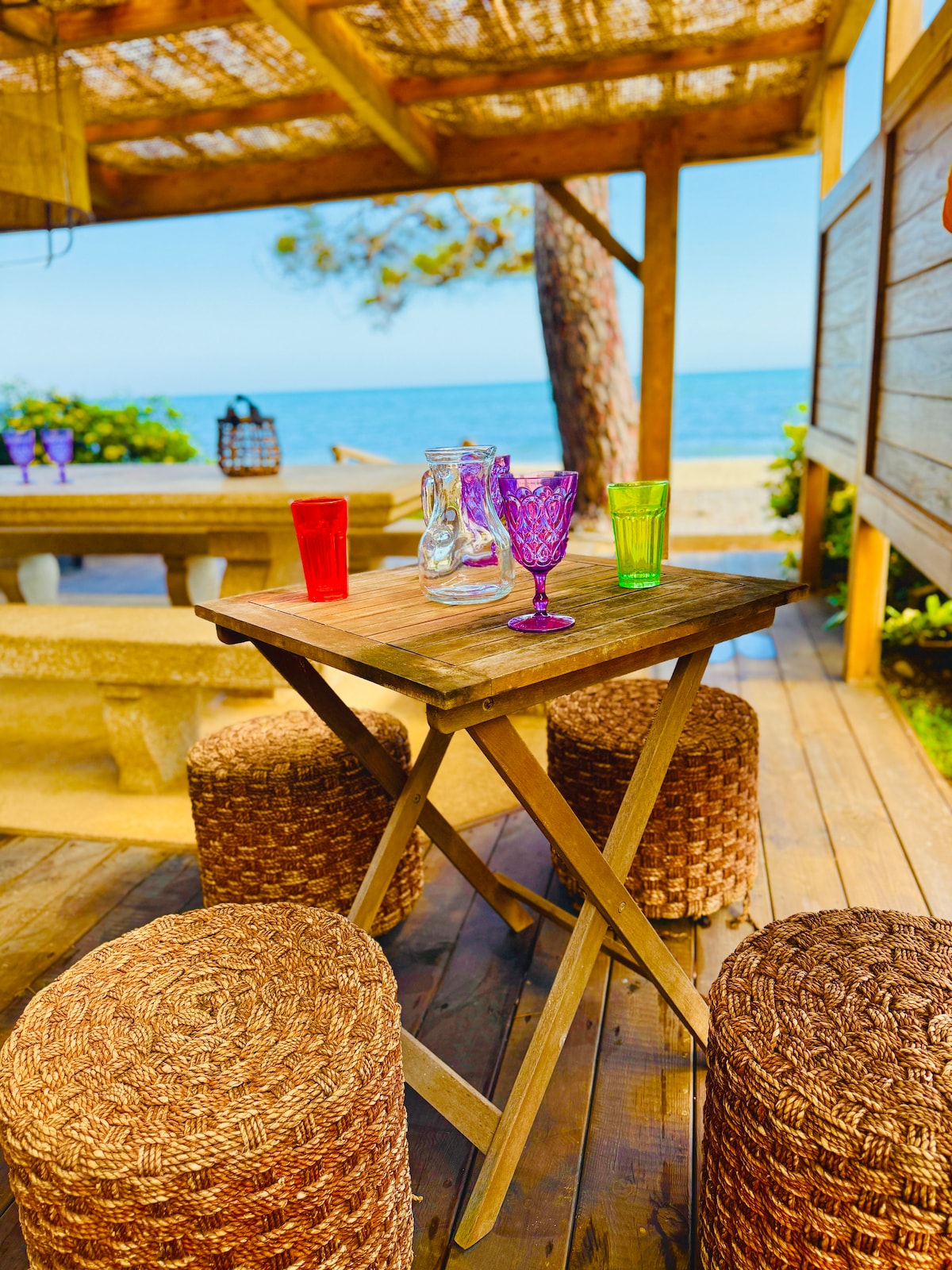 Posé sur la plage au milieu des pins, ce bungalow dispose d’une terrasse en bois d’IPE qui accueille ses convives pour les repas et le farniente à l’ombre de sa blanche pergola. Quelques marches offrent depuis la terrasse un accès privatif à la plage ou ses transats disposés sur le sable permettent de profiter du soleil et de la mer en toute sérénité. Sa large baie vitrée donnant directement sur la terrasse, permet de vivre confortablement dedans comme dehors, face à la mer.