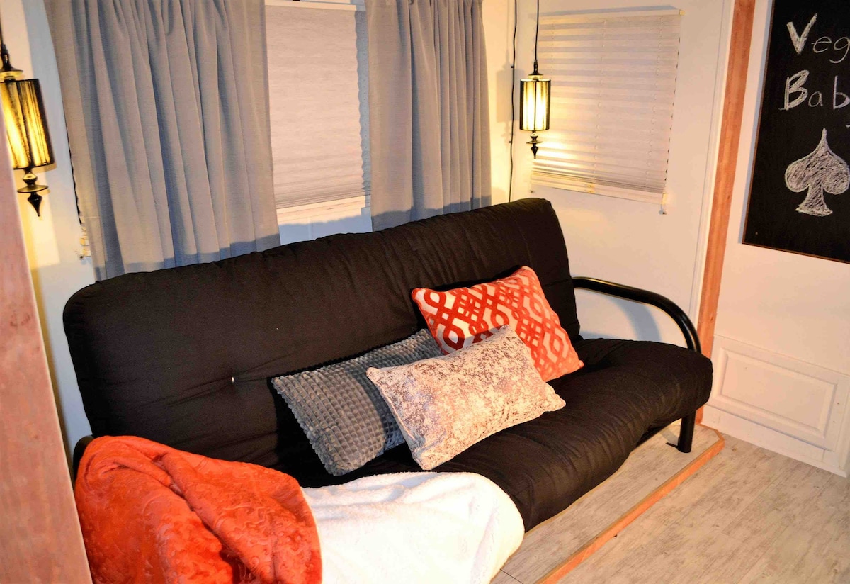 Évadez-vous dans une retraite de camping moderne avec une cour privée, un coin repas extérieur (table + 4 chaises), un barbecue en acier inoxydable et un évier extérieur. À quelques minutes du Strip de Las Vegas, des restaurants, des parcs, des cafés, des épiceries et des magasins. Avant de réserver, veuillez noter : • Aménagement de style camping-car • Repas en extérieur uniquement (pas de table à l'intérieur) • Salle de bain compacte (pas de lavabo) • Cafetière à piston + bouilloire fournies (pas de cafetière filtre) Pas un aménagement d'hôtel. Idéal pour les voyageurs à l'aise avec la vie en camping-car.