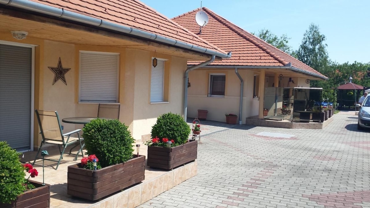 Жильё для семейного отдыха с бассейном и спортивной площадкой, местом для барбекю. Тихий и спокойный район Хевиза. Рядом расположен музей римских раскопок и детская площадка, в шаговой доступности Винная Горка с множеством ресторанов.Расстояние до термального озера составляет 1,7 км по ровной улице.